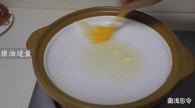 5、煮饭:锅底先刷一层猪油避免黏锅,泡好的米倒入锅中,水大概没过米1~2cm。开大火约2~3分钟将水烧开,然后转成小火,煮到看不到水,大概7~8分钟,感觉水分快收干的状态,用筷子在米饭上戳一些小孔排气,后面饭不容易结块。