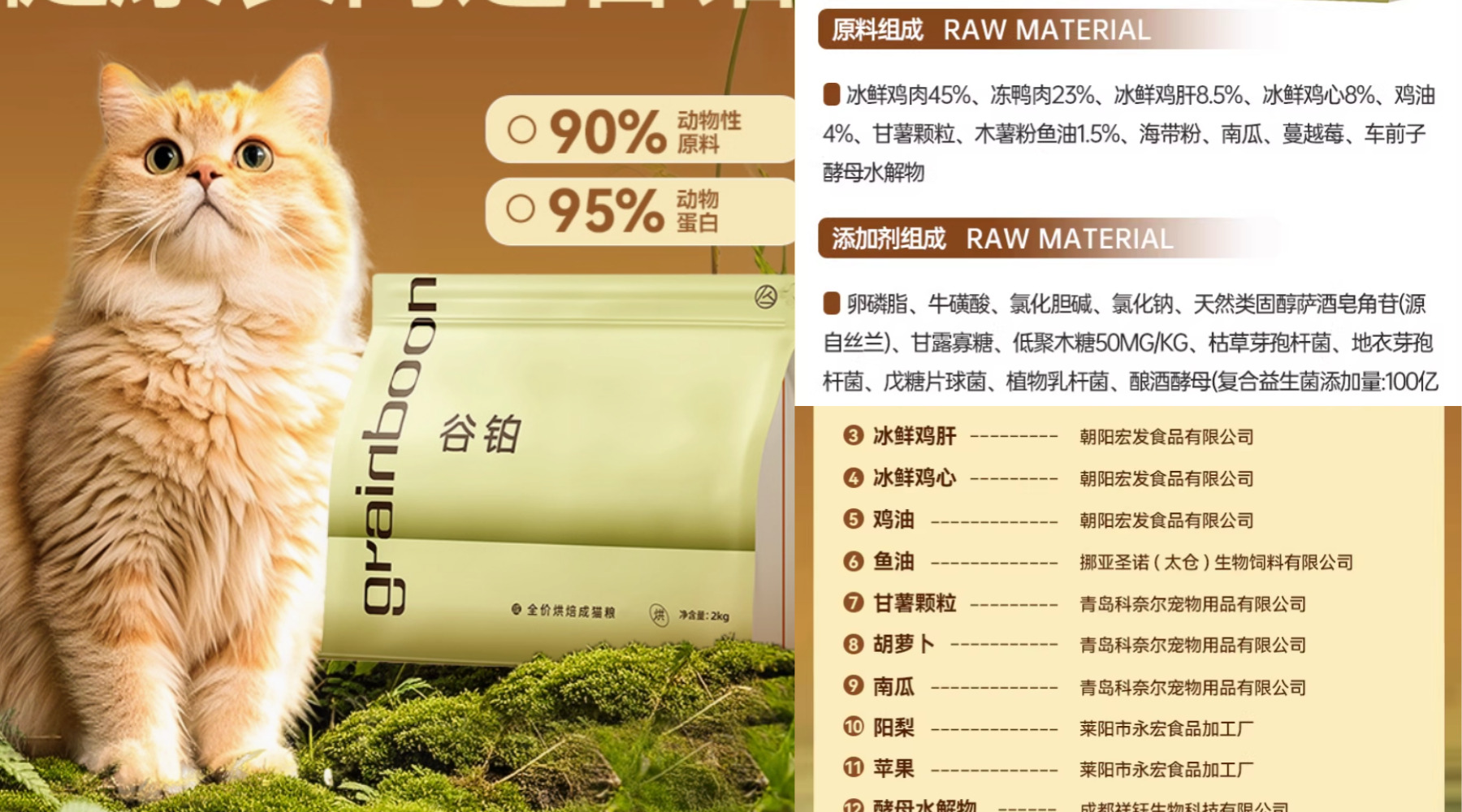 谷铂定位中高端猫粮,由辽宁海辰生产,海辰在东北算是知名宠物食品厂,给品牌做了基础背书。它主打冰鲜食材,配方里无谷物、不含诱食剂和肉粉,也没加冻干来辅助诱食。谷铂猫粮怎么样?原料用了45%冰鲜鸡肉和23%冻鸭肉,肉源来自朝阳宏发、内蒙古塞飞亚这些供应商,能查到溯源信息,公开程度还行。碳水靠甘薯颗粒提供,低敏表现尚可。生产流程由海辰把控,还算规范。营养上蛋白质40%、脂肪20%,蛋白主要来自动物,维生素矿物质都包含了。