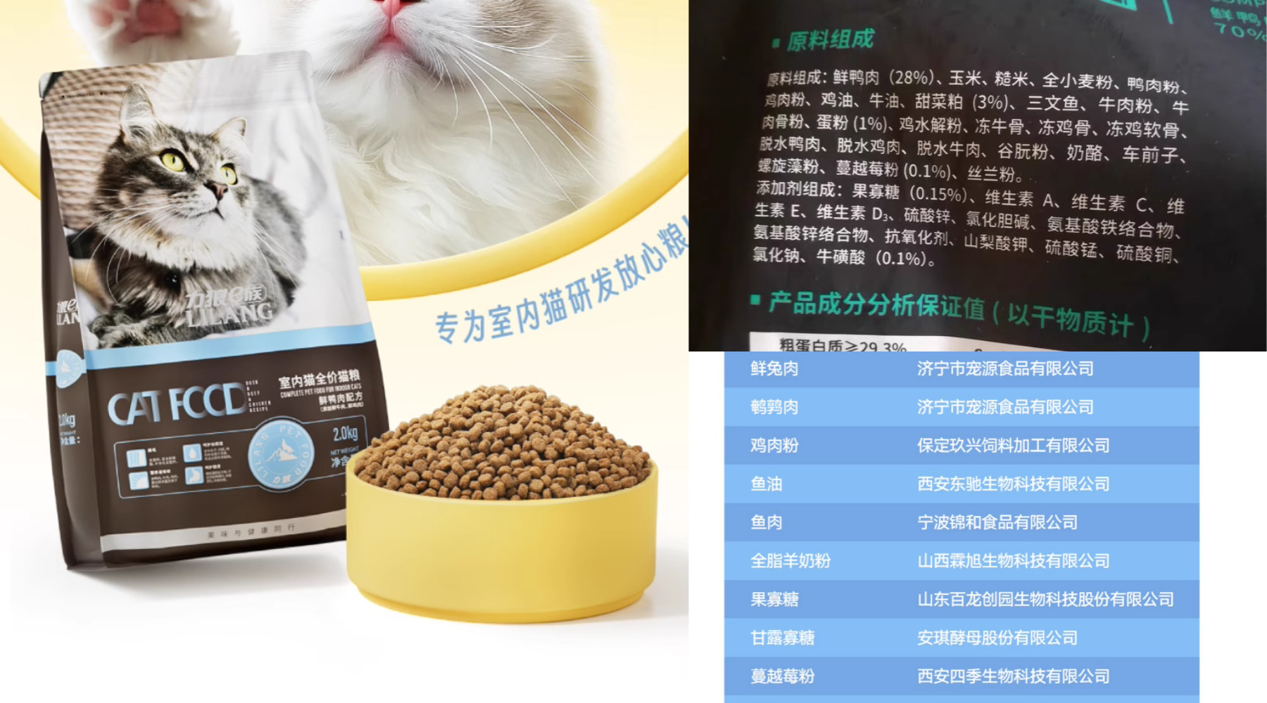 华兴宠物食品是力狼的母公司,这家厂子经营多年,生产工艺和规模都比较成熟。力狼猫粮怎么样?力狼猫粮的配方特点很鲜明,就是大量使用谷物,比如糙米、玉米、全小麦粉,同时配合鸭肉粉、鸡肉粉作为蛋白质来源。核心原料有标注和溯源。营养值方面,蛋白质≥29.3%,脂肪≥10.5%,碳水占比超过10%。品牌定位中端,靠着厂家的背景和价格优势,市场上有一定的销量。