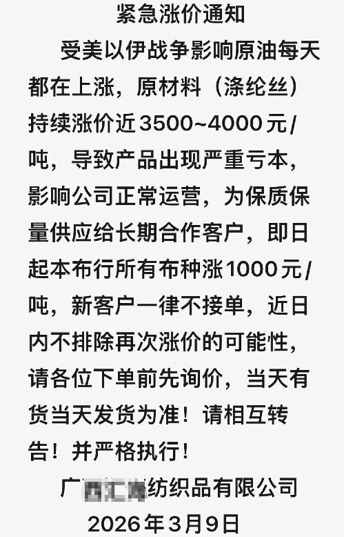 上个月 9 号,也就是3月9号。合作了十几年的上游纺织厂,直接甩来一张紧急涨价通知,核心内容一句话就能概括:受美以伊战争影响,原油天天涨,我们做布料的核心原料涤纶丝,一吨涨了 3500-4000 块,所有布种每吨统一涨 1000 块。