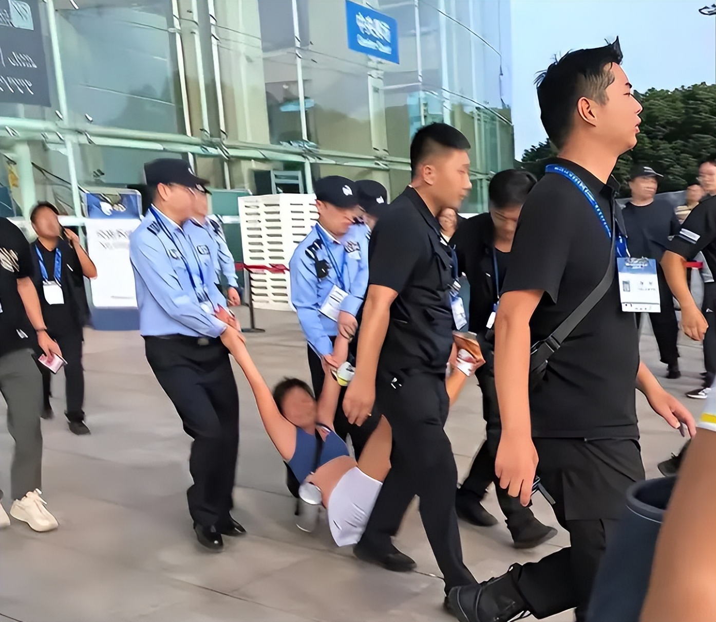 几名安保人员再次上前耐心劝说,她却变本加厉,尖叫着反抗,甚至试图冲向场地,在三次口头警告均无效后,为了保护受惊的孩子,安保人员优先将孩子妥善安置,随后四五人合力,架着谢某某的胳膊和腿,将她强行抬出场地。