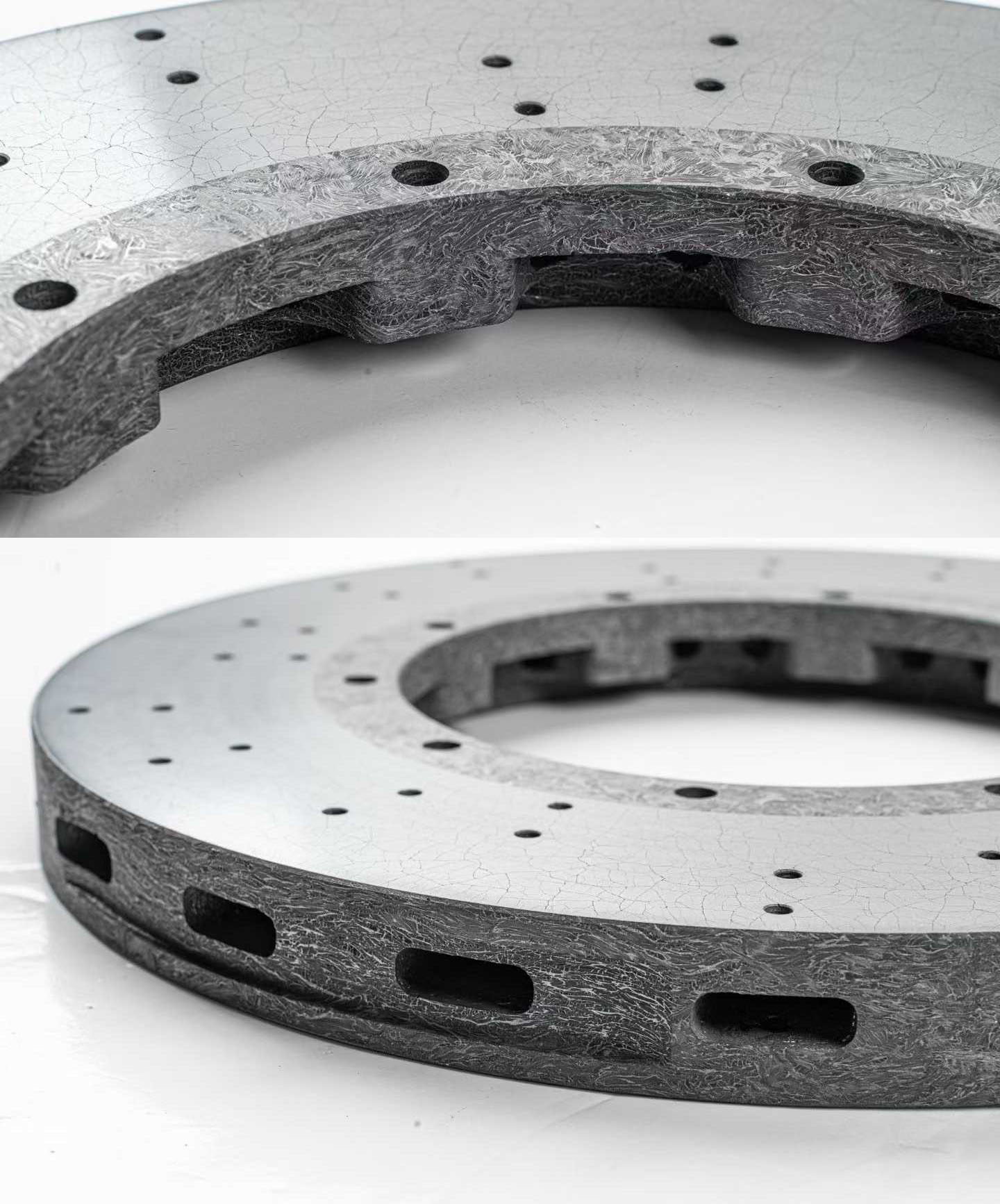 它的优点是制造工艺相对简单、生产周期短、成本较低。它依然具备了碳陶盘基础的“轻量化”特性,比传统铸铁盘轻很多。但它的致命弱点在于整体结构强度不足。因为内部的碳纤维是断裂、随机分布的,就像用碎木屑压制成的密度板,缺乏整体的物理拉扯力。在赛道激烈驾驶或重型电车连续重刹产生极高热应力时,短纤盘容易发生表面氧化、掉渣,如果在高温下受到石子飞溅等物理撞击,甚至有开裂的风险。这也是为什么很多早期的廉价碳陶盘被玩家吐槽“太娇贵”。