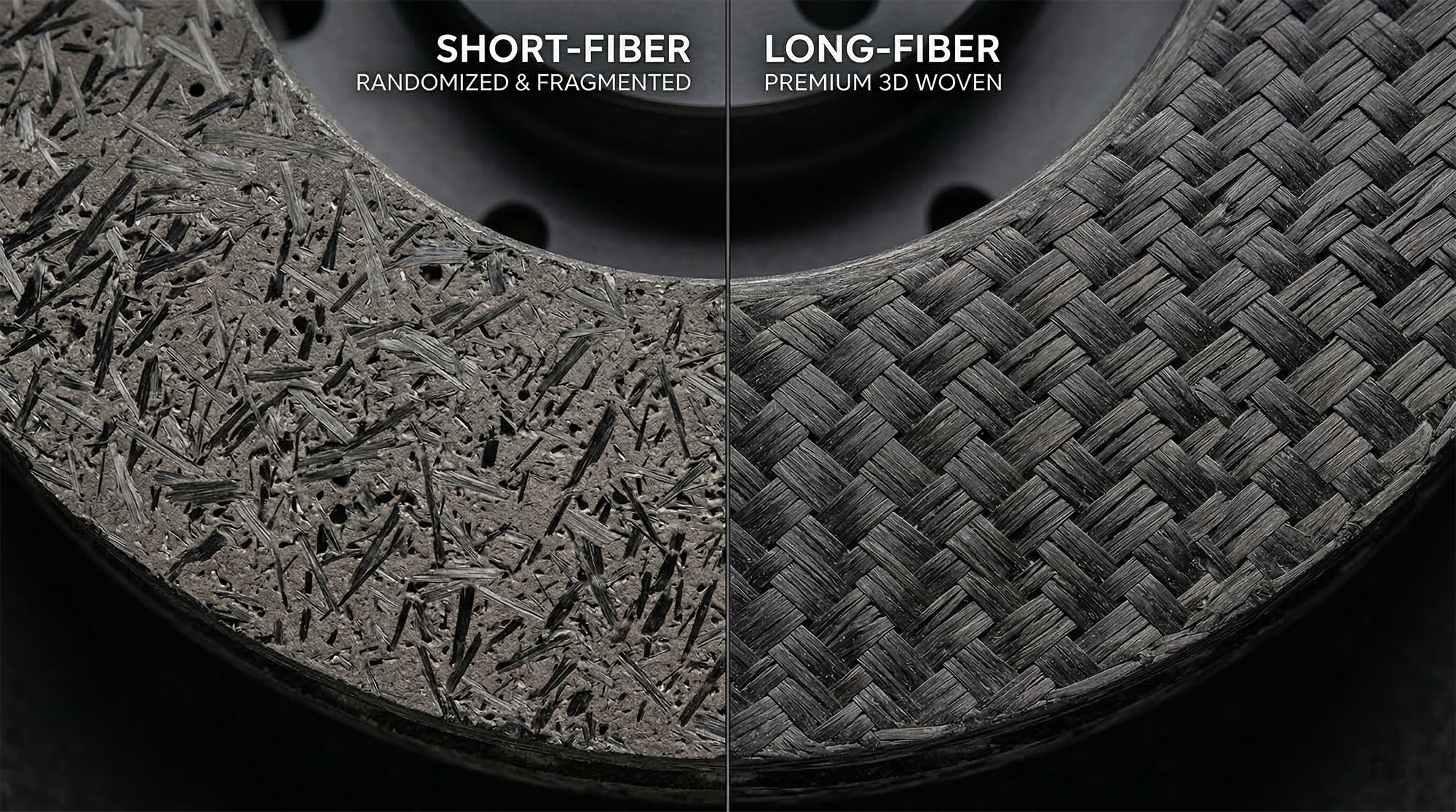 由于内部是一个完整的、千丝万缕相互交织的编织网结构,长纤盘的抗拉伸强度、抗断裂韧性和导热效率远超短纤盘。它就像是用钢筋编织成的混凝土防撞墙,不仅不怕日常的石子飞溅,更能在突破 1000°C 的极端高温下保持绝对的物理稳定性,不掉渣、不变形。这才是真正意义上“用不坏”的航天级制动材料。