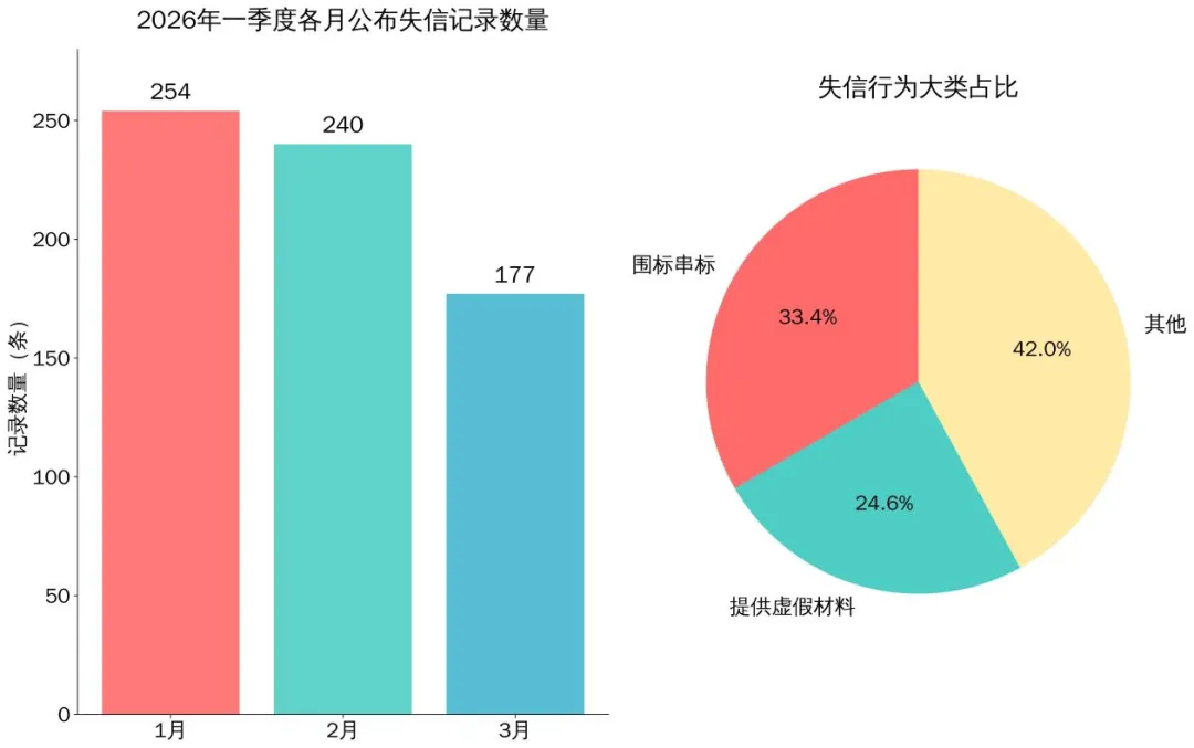 同时,一季度各个月份政府采购失信数据呈现出“前高后低”走势,分别为254条、240条、177条,这一特征与监管公示节奏及采购周期高度关联。