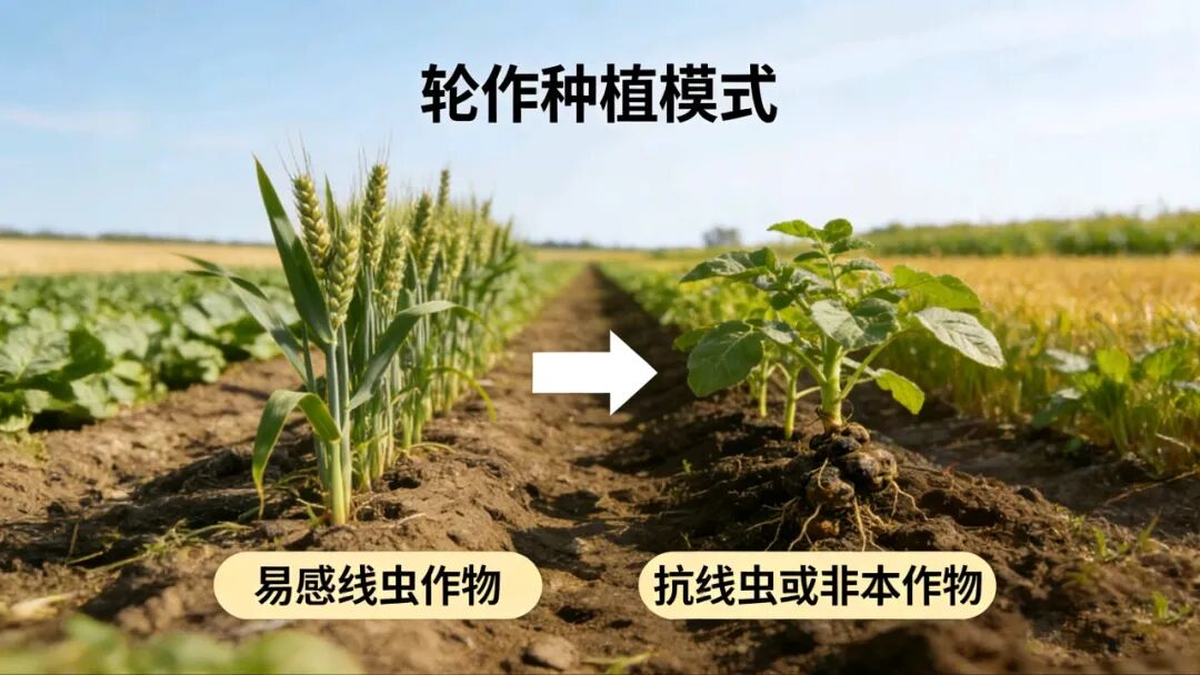 这个方法就是非常简单,每年种植的作物不同,那就是轮作。看似简单,实际上不同作物之间的轮作,还是有讲究的。比如:与禾本科作物(如玉米、大豆、小麦等等轮作)、葱蒜类或万寿菊等轮作,可显著降低土壤中线虫基数。