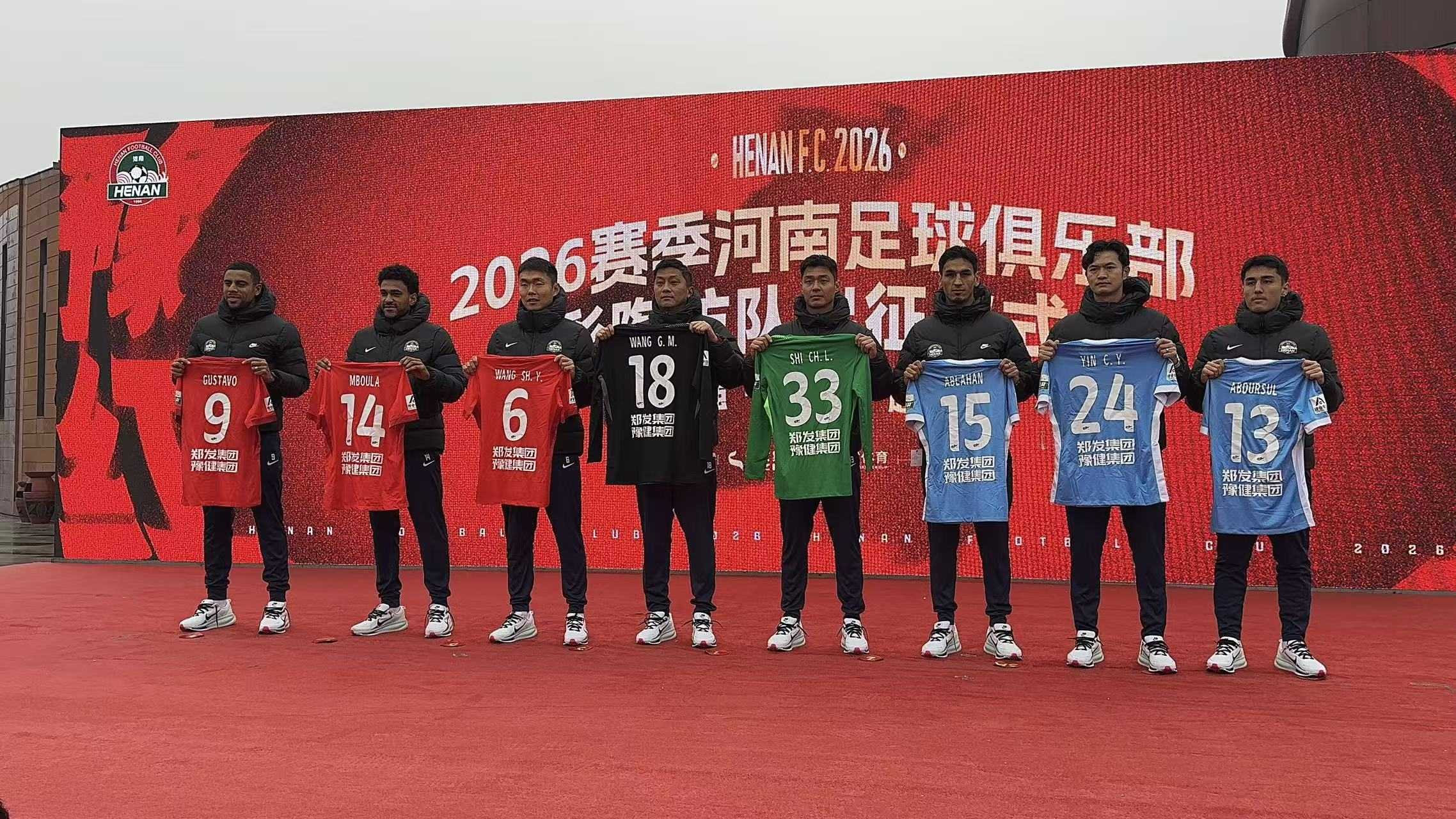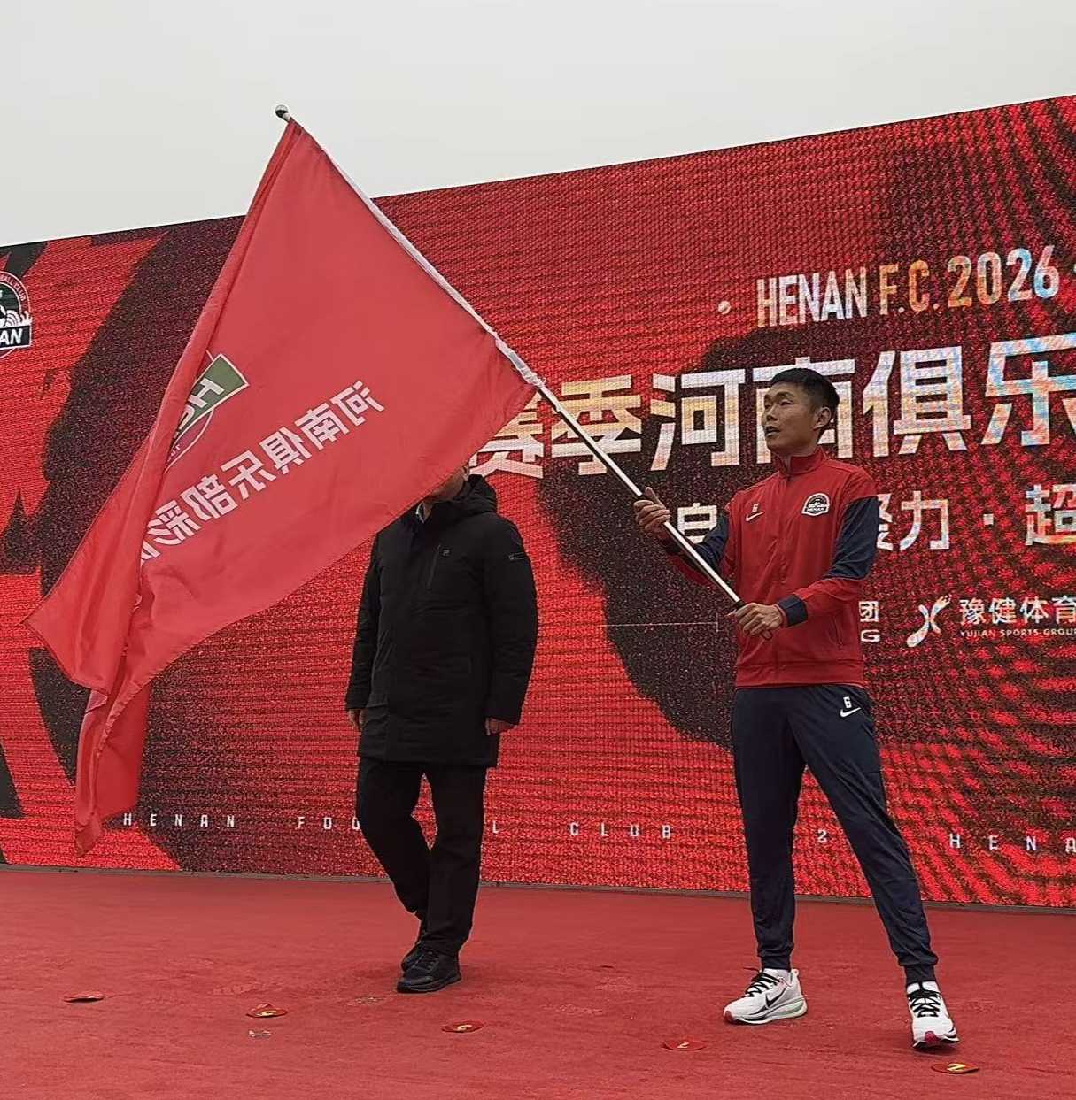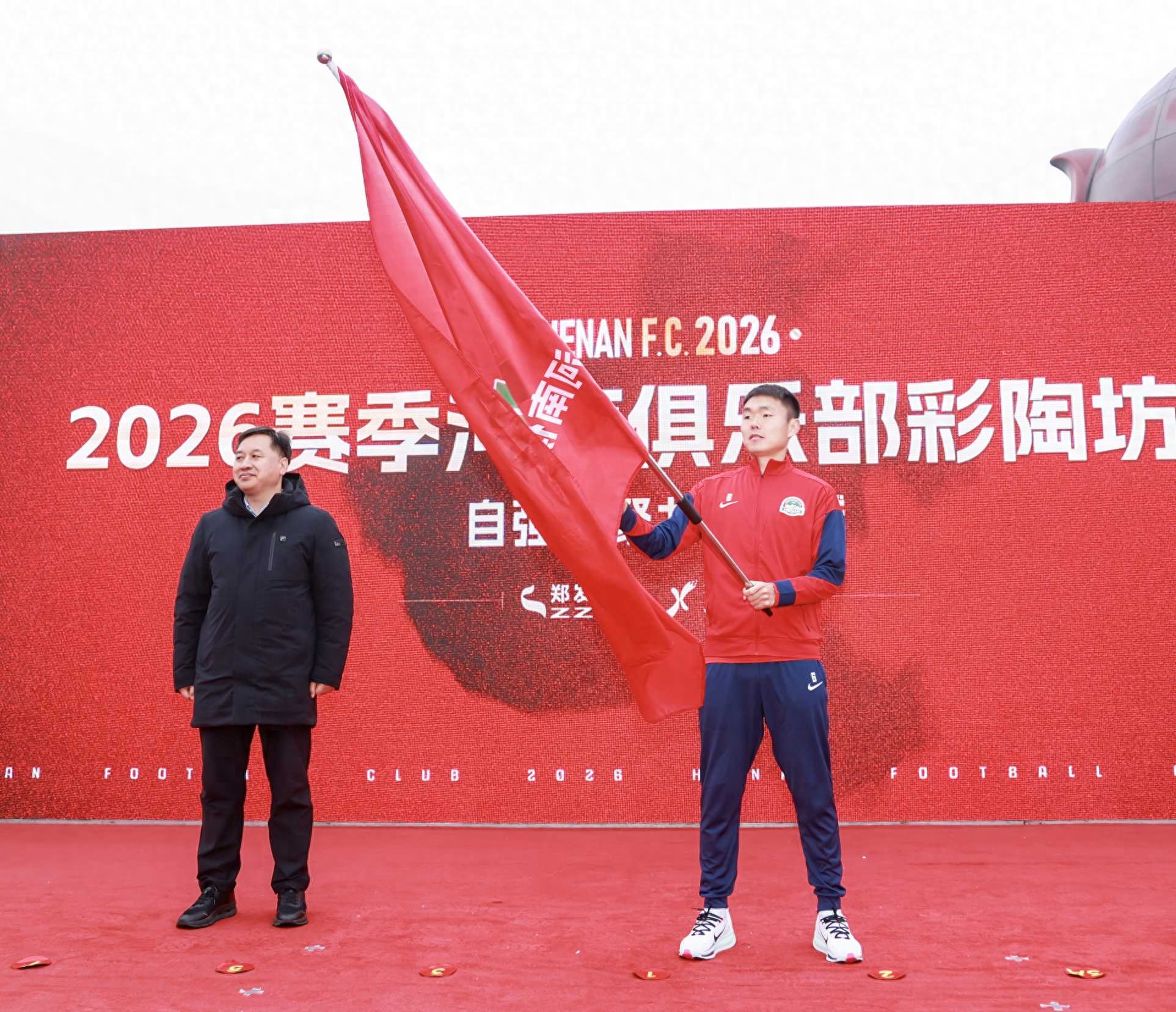 仪式现场,河南足球俱乐部与仰韶酒业正式签署合作协议,球队新名称随之揭晓——河南俱乐部彩陶坊队。随后,河南队全体教练组成员、球员亮相,球员代表展示了新赛季主客场球衣。授旗环节,河南队队长王上源接过队旗奋力挥舞,这也标志着河南彩陶坊队正式踏上了中超2026赛季征程。