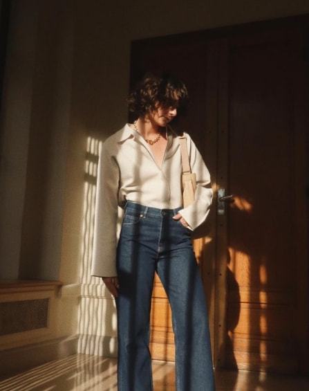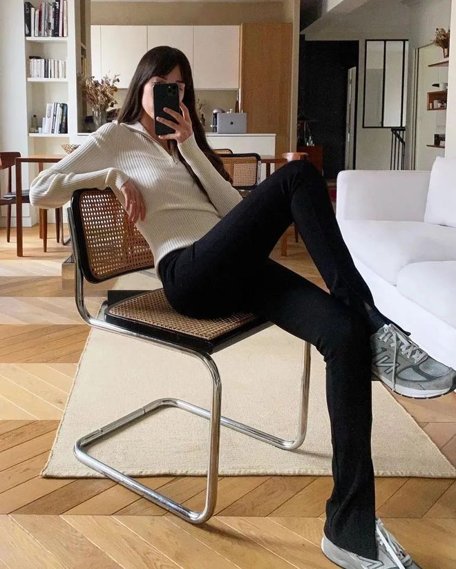 像博主Leia Sfez,紧身款的毛衣与微喇裤结合,细腻柔软,休闲洒脱,让身材看起来更迷人~