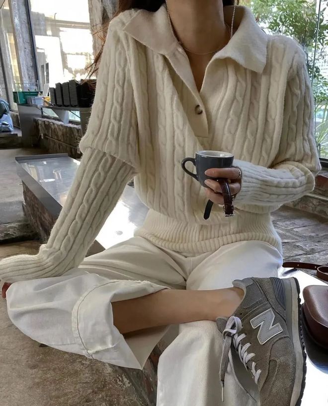 或者选择不系纽扣的穿法,随意穿上一条休闲裤,营造慵懒随性的style,让简约的毛衣更有韵味~
