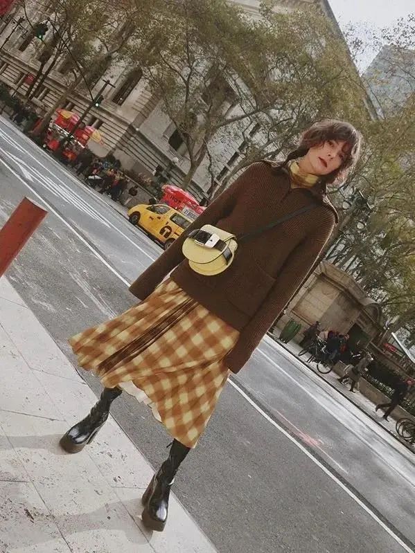 想要增加视觉上的造型感,大翻领的毛衣内搭亮色的高领打底衫,搭配半身裙,层次感十足~
