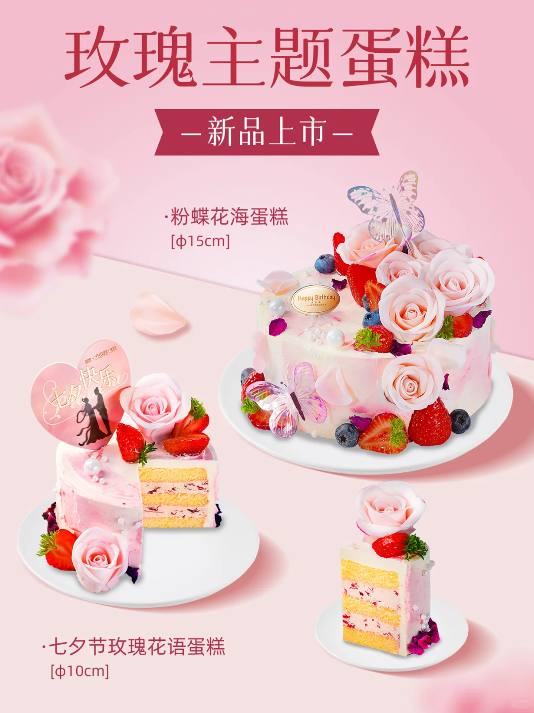 七夕节限定蛋糕来了!以玫瑰为主题,选用特调云南玫瑰奶油夹心,加上可以食用的玫瑰花瓣,这个蛋糕是懂浪漫的。