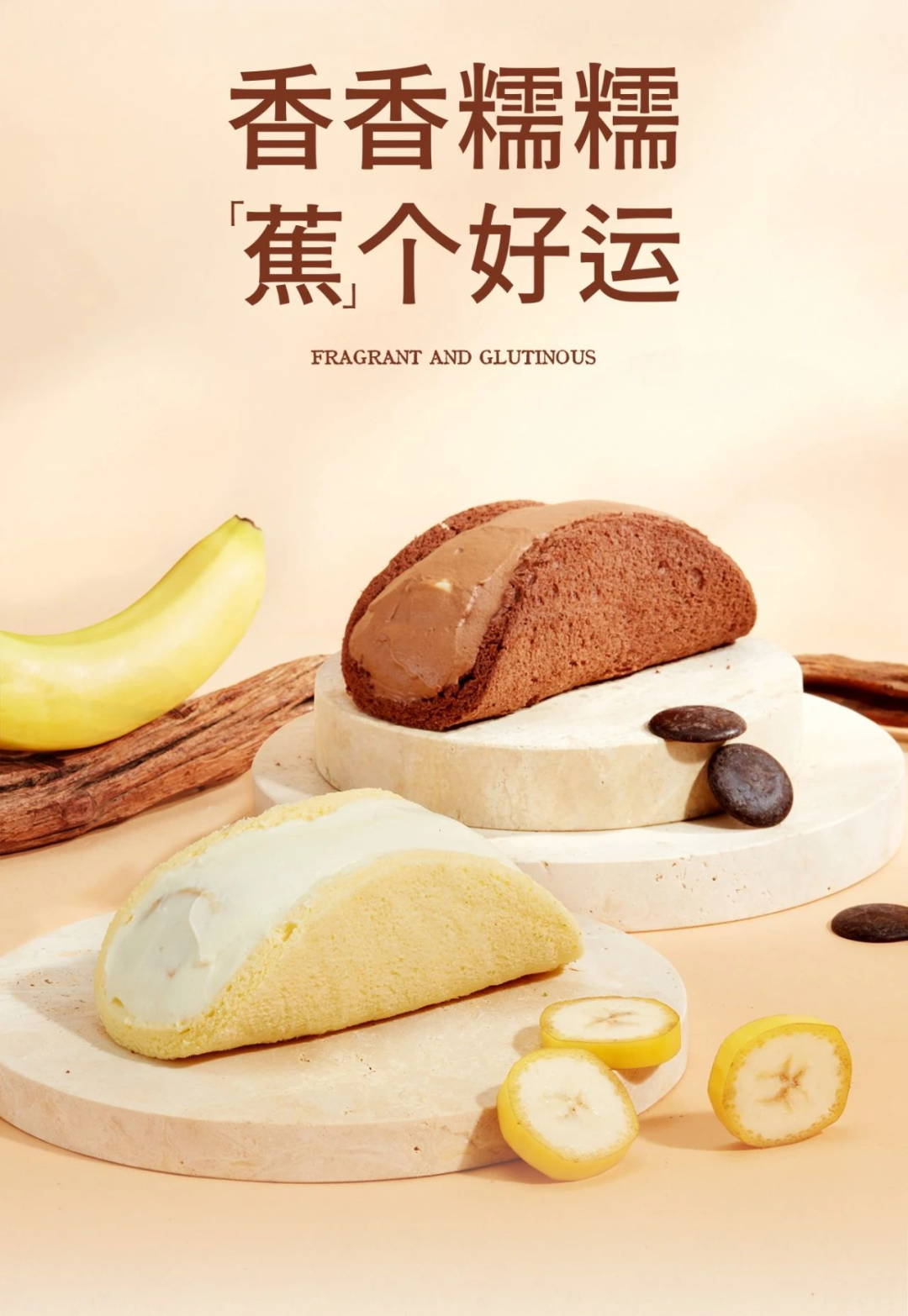 「原味巴拿拿蛋糕卷」纯正奶香,口感丝滑,包裹着一整根香糯甜蕉。「巧克力巴拿拿蛋糕卷」,可可戚风轻盈松软,可可奶油浓醇,包裹一整根香糯甜蕉。