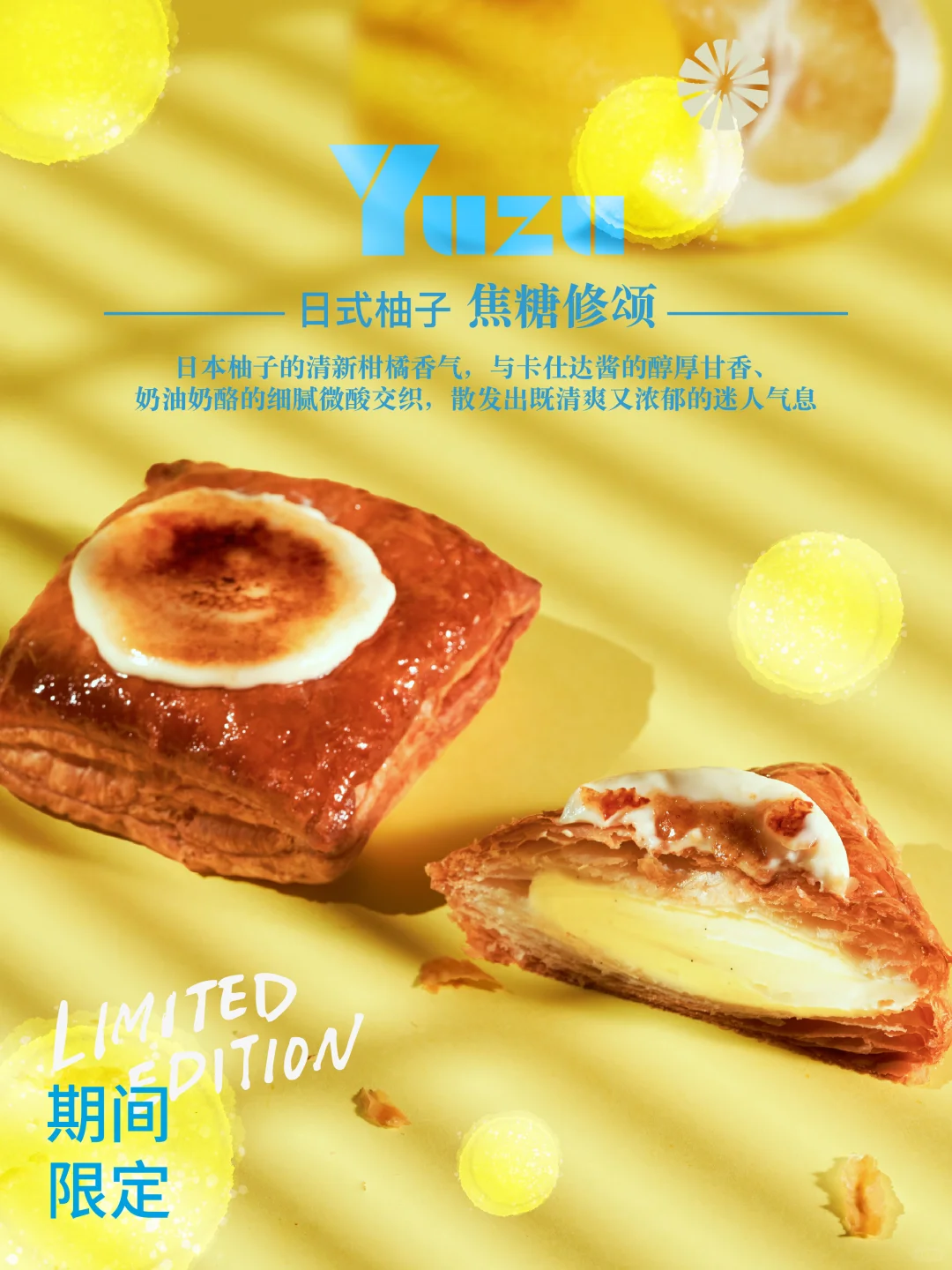 柚子风味内陷清新酸甜,果香浓郁,修颂顶部奶酪与焦糖炙烤,色泽诱人,焦脆香甜,层层酥脆的酥皮,一口爆浆,满分口感!