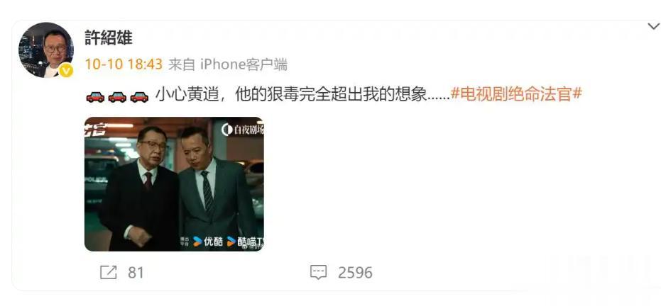 而他的最后一条微博是在 10 月 10 日,内容是宣传新剧《绝命法官》 。在剧中,他饰演法院院长卢维德,为了坚守正义,不肯与坏人同流合污 。为了宣传这部剧,许绍雄可谓是尽心尽力,他不仅在微博上多次分享剧中的精彩片段和自己的感悟,还积极参与各种宣传活动 。他对作品的认真态度和对观众的负责精神,让人敬佩不已。在宣传过程中,他还会耐心地回答粉丝们的问题,与他们互动,丝毫没有大明星的架子。 尽管当时他已经身患癌症,但他依然坚持工作,为观众带来更多优秀的作品 。他的敬业精神和对演艺事业的热爱,让无数人为之动容 。他用自己的实际行动诠释了什么是真正的演员,也为年轻一代的演员树立了榜样。
