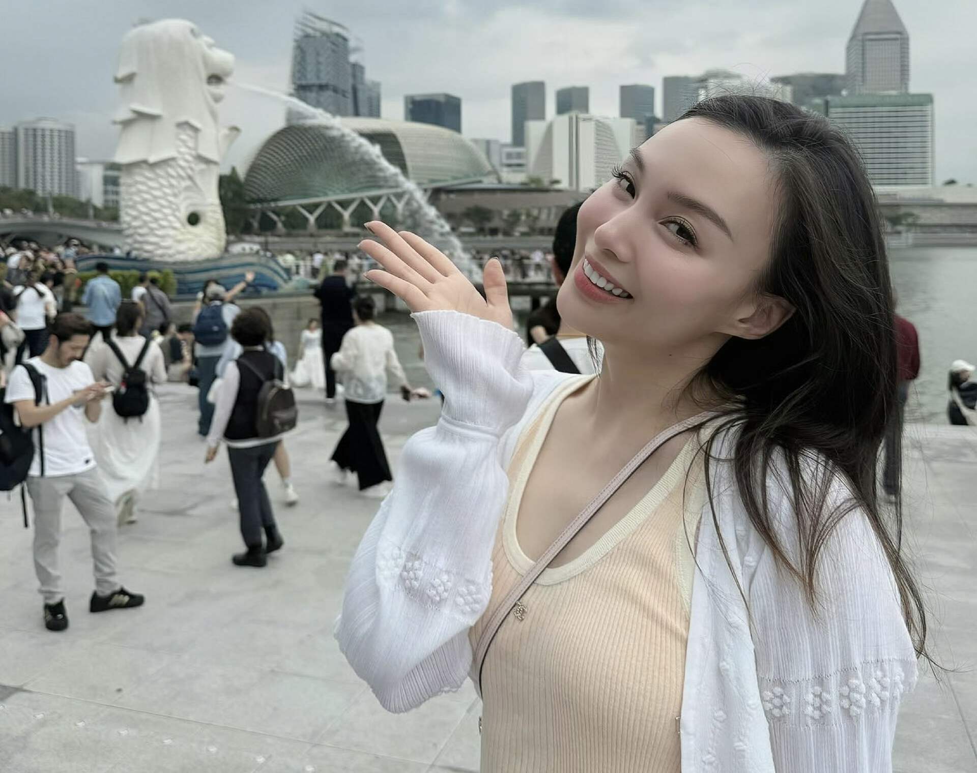 照片中,朱璇到了新加坡旅游。和当地的标志性建筑鱼尾狮合照留念,表情看上去非常开心。