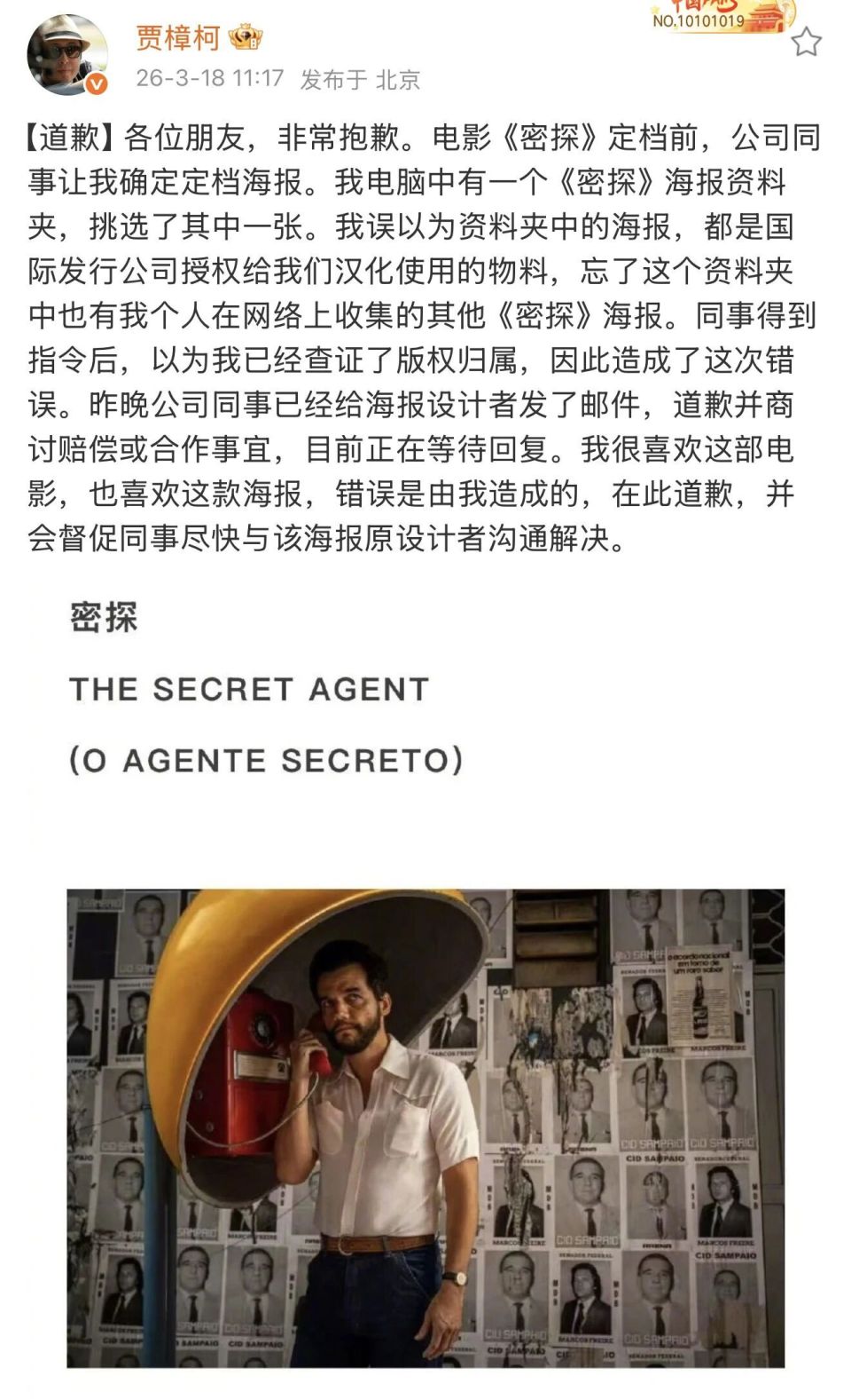 3月18日,导演贾樟柯在个人社交平台发文道歉。他解释称,自己电脑里有一个存放《密探》海报的文件夹,他误以为里面的海报都是国际发行方授权可用的物料,便挑选了一张交给团队。他忘了这个文件夹里也混入了自己从网络收集的、未经授权的作品。团队基于对他的信任也未再核查,直接进行了汉化和发布 。