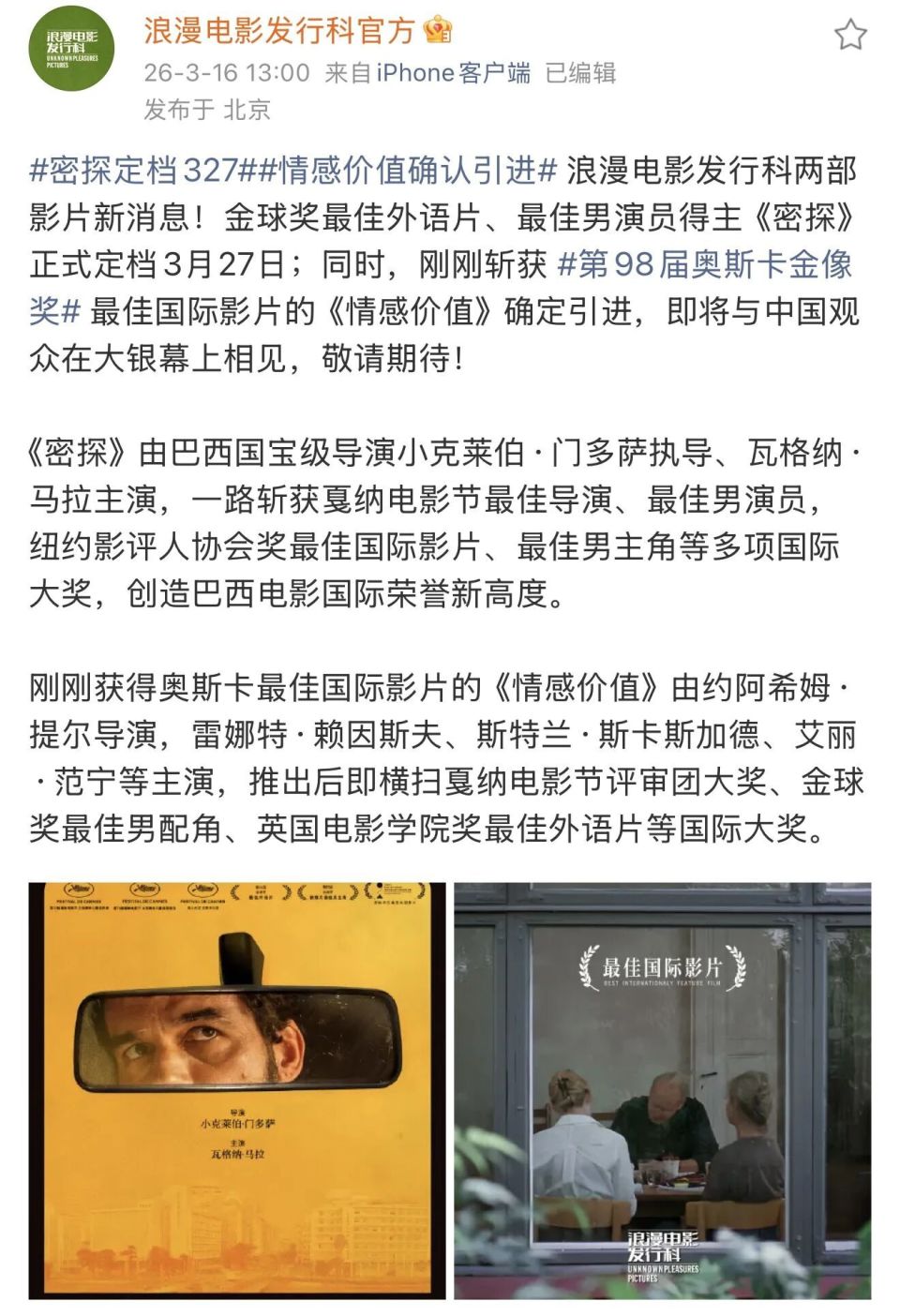 至此,通过“贾樟柯道歉”的热搜,吃瓜群众都知道3月27日《密探》要上映了,顺便在浪漫电影发行科的社交平台还能发现:“哦,《密探》还得了这么多行业大奖呢!”