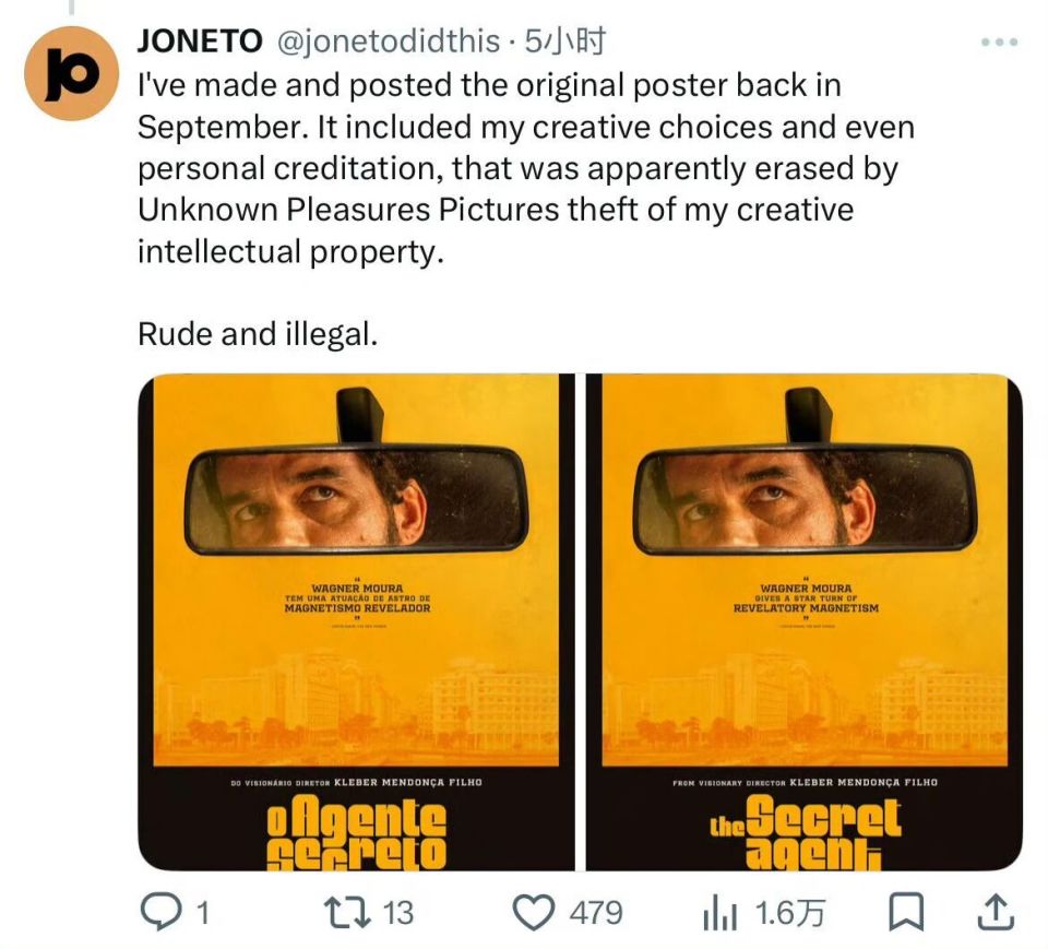 随后,该海报的巴西原设计师 JONETO 在社交平台发文,指控该海报是在未获授权的情况下,盗用其原创设计并抹去署名后进行“汉化”的,行为“无礼且违法” 。