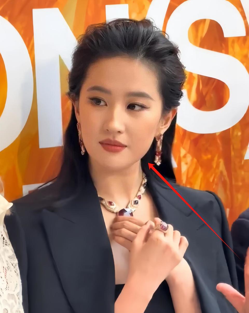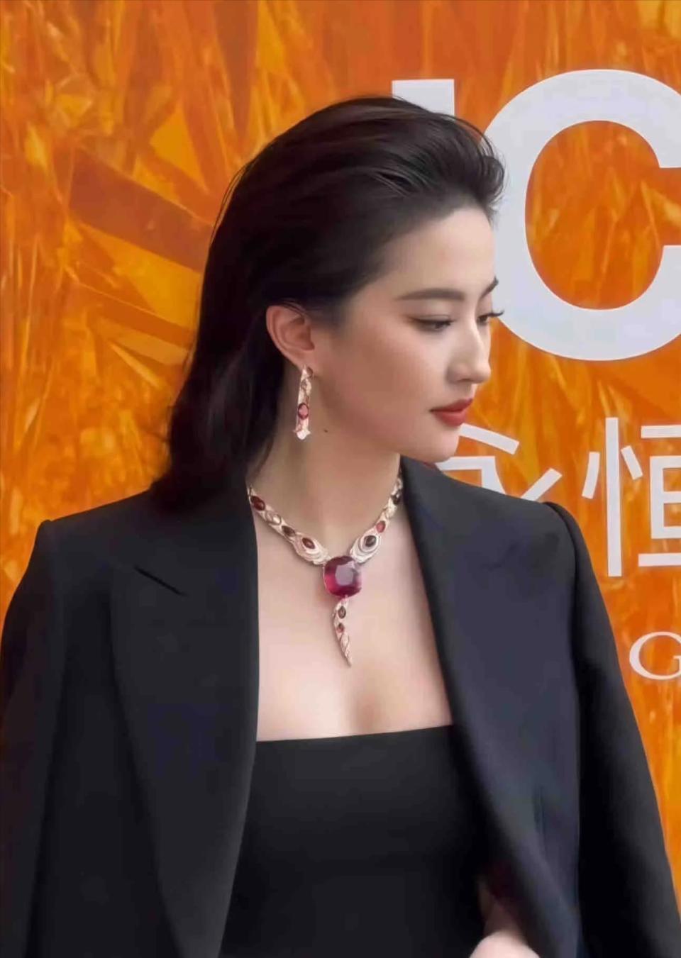 脖子上戴的红宝石,要不是为了给它让位,都怕刘亦菲捂着脖子出镜。