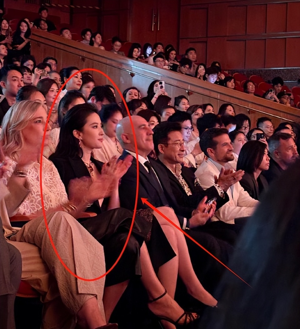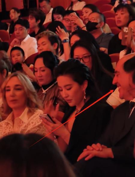 比粉丝还要夸张的,就是坐在刘亦菲身边的光头高管,那视线是紧紧盯着刘亦菲,连她拿手机也没避开视线。