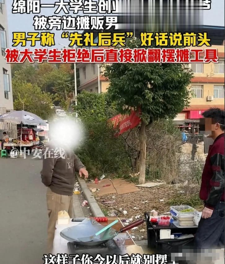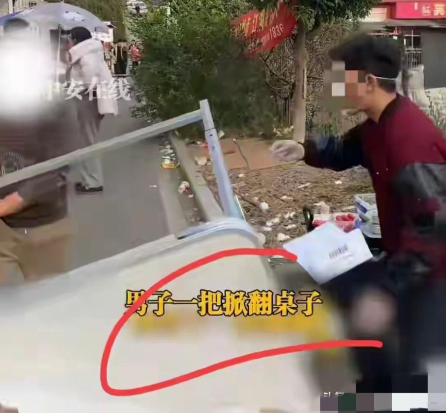 警察赶到后查明了,原来那大叔也是在附近摆摊的,他看大学生摊位前排着队,觉得自己生意不好做了,就去找麻烦。摊子被掀了之后,大学生的东西全摔地上,手机、锅碗瓢盆都给弄坏了。场面挺乱的,大学生气得差点动手,好在被旁人拉住了。