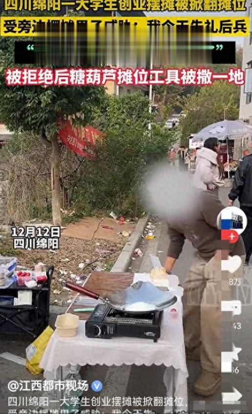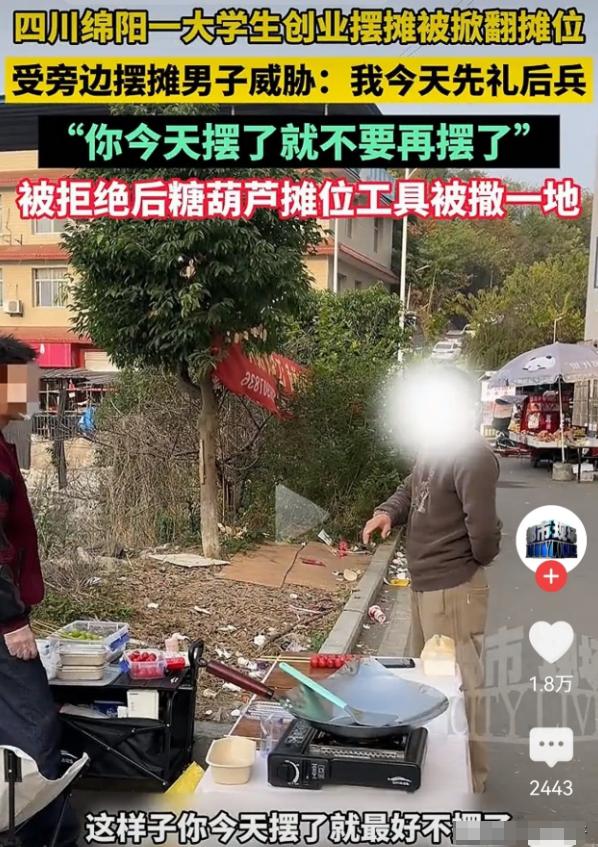 这几天网上有个事儿挺火的。四川绵阳有个上大学的小伙子,为了挣点生活费,就在学校门口摆了个冰糖葫芦摊子。结果没摆几天,就遇上一个中年大叔,告诉他别做了。大学生不答应,结果那大叔一气之下,直接把摊子给掀了。