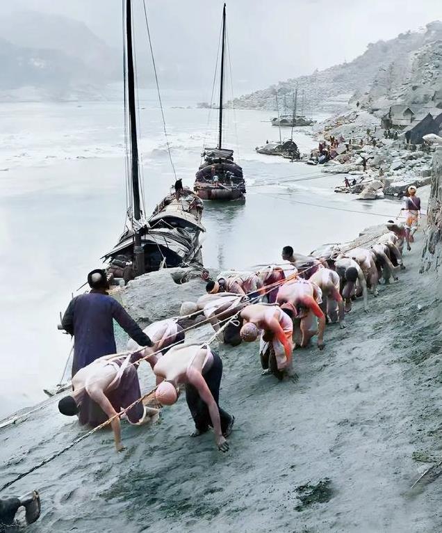 △峡江边的纤夫,拼尽全力拉纤,使货船能逆流而上。