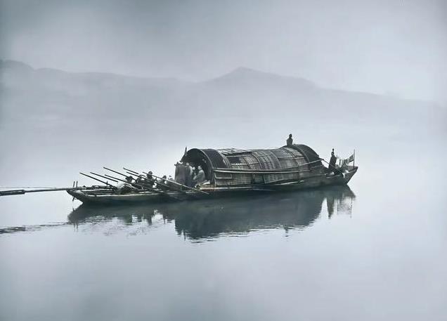 △三峡中的一条小船,四周雾气茫茫,显得宁静祥和。