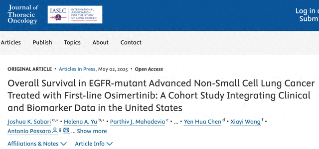 Sabari JK, et al., Overall Survival in EGFR-mutant Advanced Non-Small Cell Lung Cancer Treated with First- line Osimertinib: A Cohort Study Integrating Clinical and Biomarker Data in the United States, Journal of Thoracic Oncology (2025).