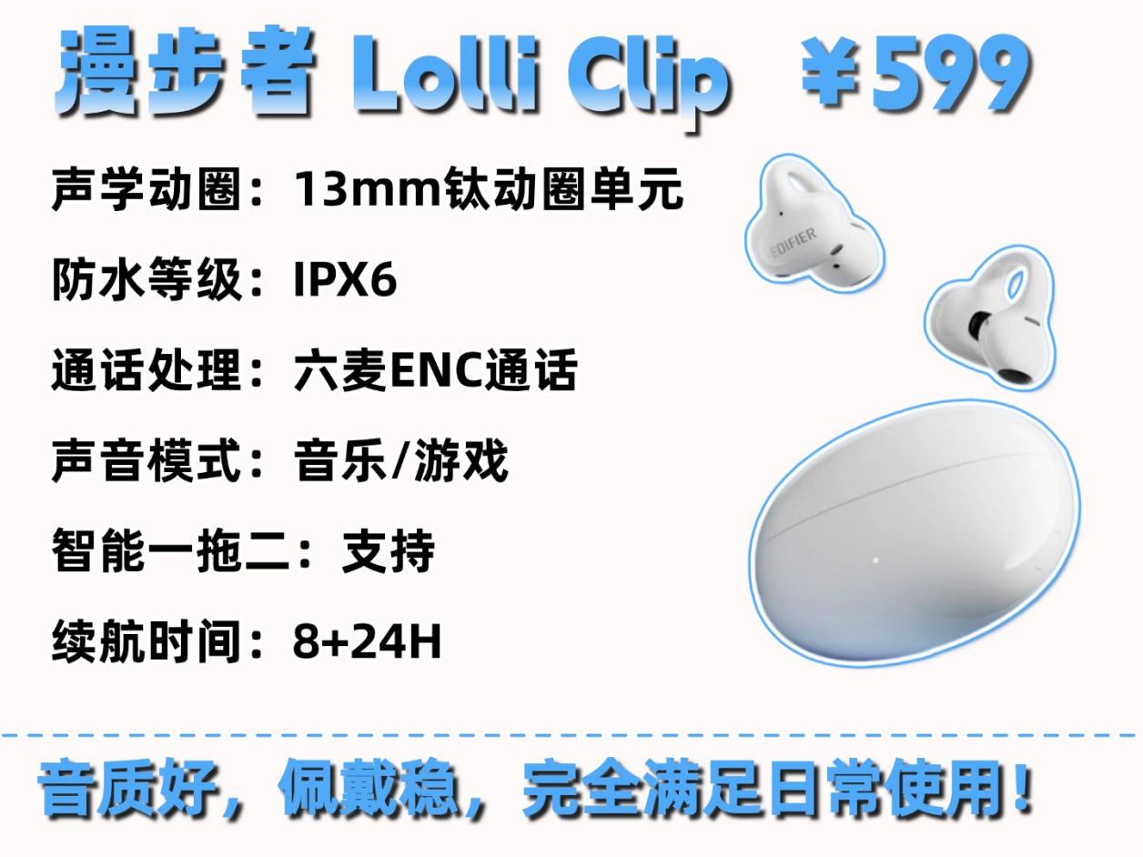 漫步者这款耳夹耳机,同价位里算很能打的,日常用着特别顺手。这款耳机的音质表现很稳,13mm 动圈单元日常听歌完全够用。最惊喜的是支持空间音频和头部追踪功能,听音乐时包围感特别强,很容易沉浸进去。同价位耳夹耳机里能有这功能,竞争力确实挺强。