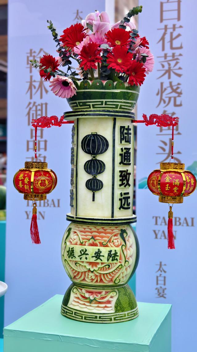 在安陆太白宴的展台上,一道道精美的菜肴,色彩搭配精妙绝伦,红的如玛瑙般明艳,绿的似翡翠般清透,黄的像日光般灿烂,交织出一幅绚丽的视觉画卷 ,光是看着就已令人垂涎。宛如一件件精美的艺术品,厨师以精湛刀工将食材雕琢成栩栩如生的花鸟鱼虫,摆盘错落有致,层次分明,每一处细节都尽显匠心独运。