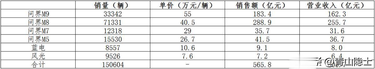 根据“汽车之家”披露的数据,2025年8月,问界M9卖了10067辆,问界M8卖了21537辆,问界M7卖了3719辆,问界M5卖了4689辆。按照这个比例关系,我们可以估算出2025年3季度,问界旗下各车型的季度销量数据。