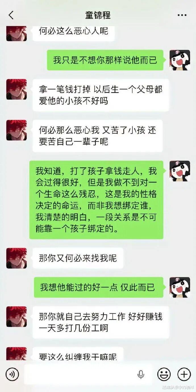 童锦程回答也很干脆,开始是劝她打掉,明确自己不想要女方还坚持生后,直接让对方走法律程序,不接受女方的其他要求,于是女方就想到了以前互联网无往不利的小作文。