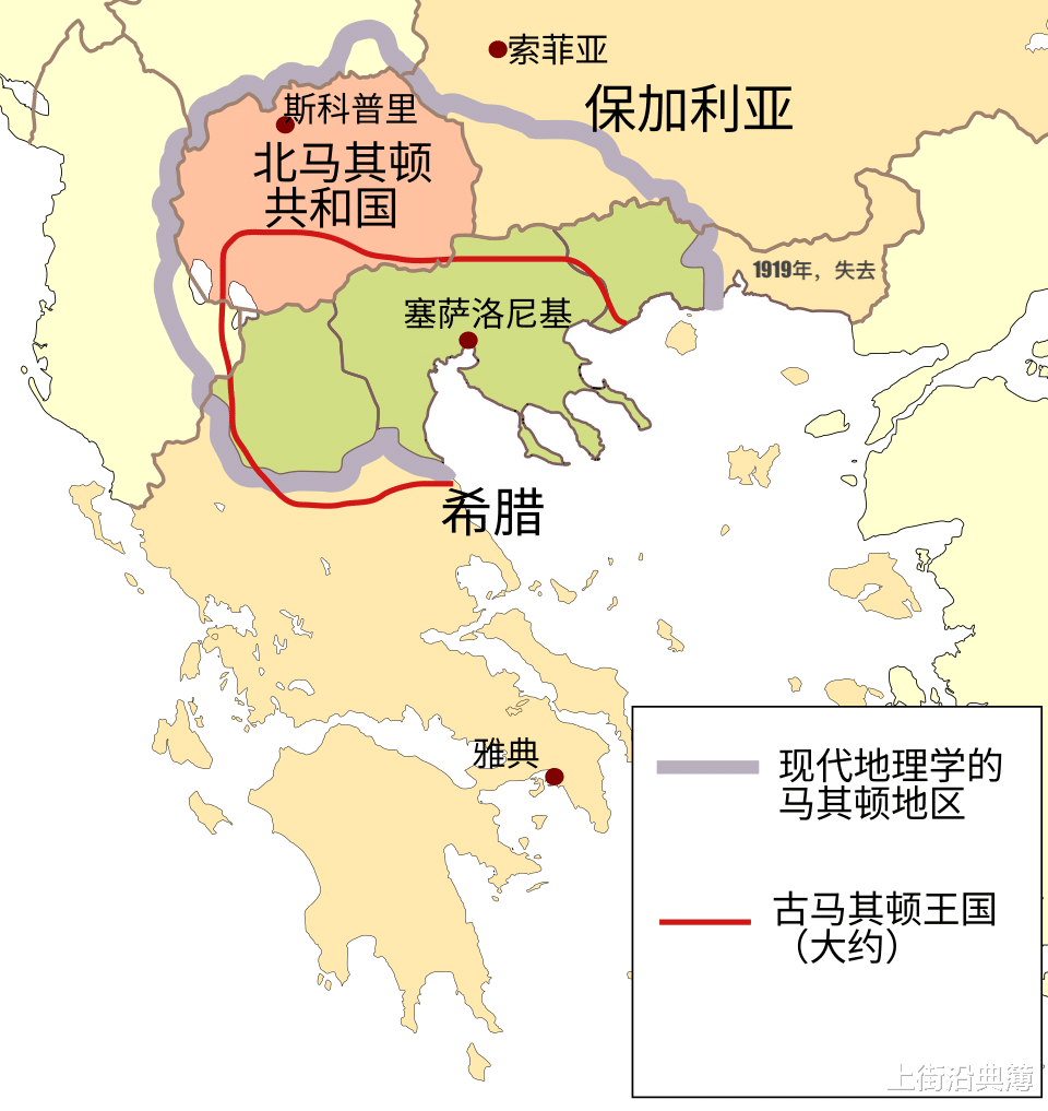 1913年,第二次巴尔干战争结束。《布加勒斯特条约》签订,大马其顿地区被一分为三。希腊拿走爱琴马其顿(南部,最大块)。塞尔维亚拿走瓦尔达尔马其顿(西北部,也就是现在的北马其顿)。保加利亚只剩皮林马其顿(东北一角,最小块)。
