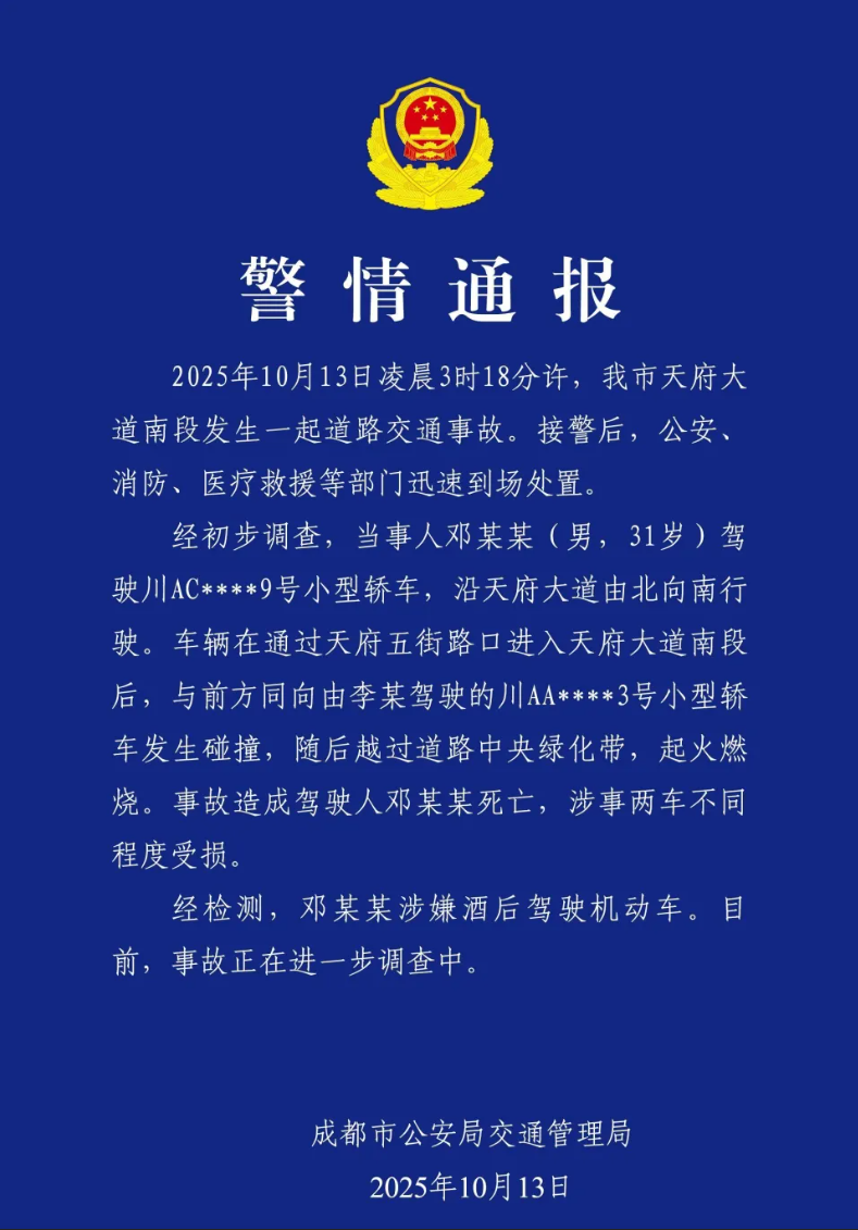 成都警方也迅速发布通报,“经检测,邓某某涉嫌酒后驾驶机动车。目前,事故正在进一步调查中“。涉嫌酒驾,意思就是车主有酒驾的嫌疑,但尚未确定,具体是不是酒驾还不清楚。