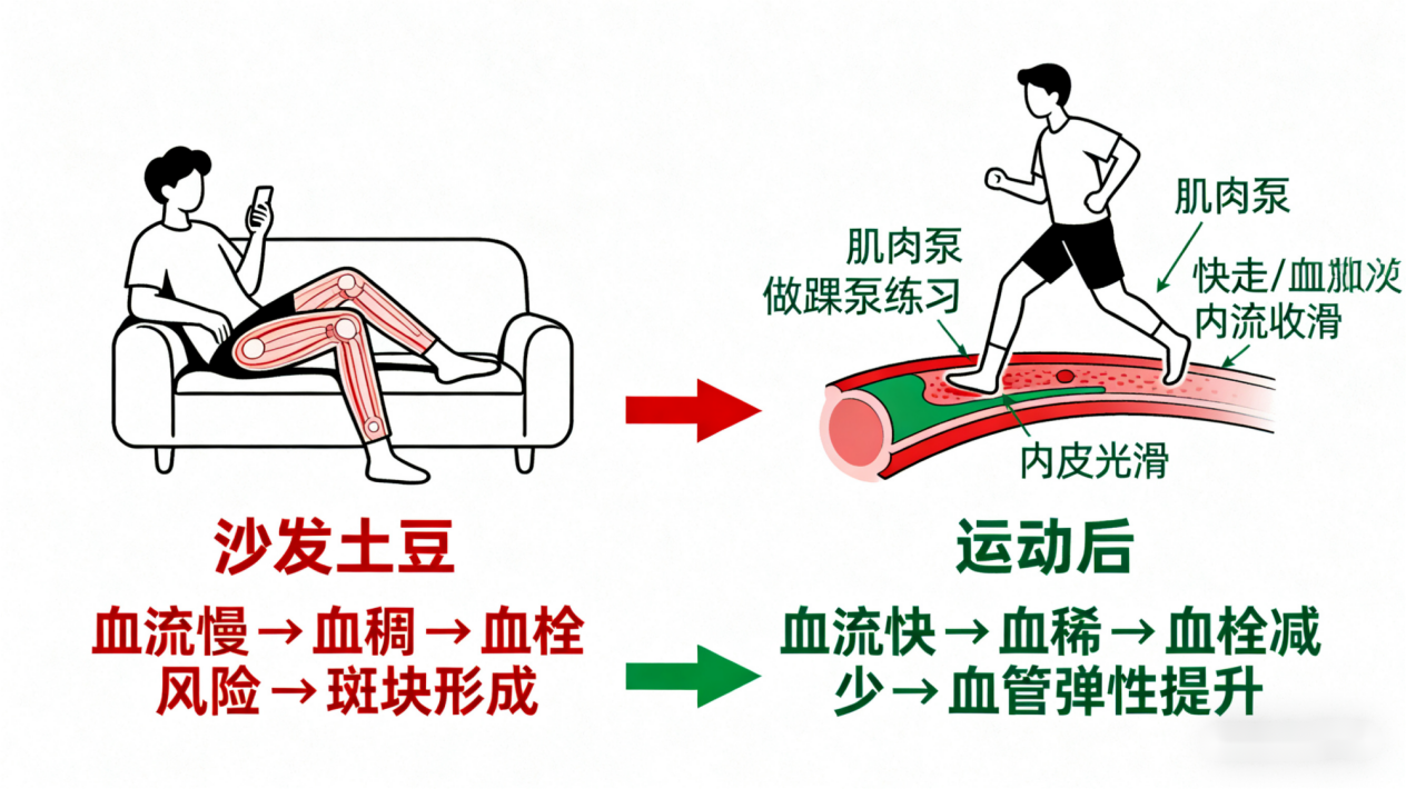 首先,血会变“稠”。老坐着不动,身体代谢慢了,水分消耗也少,你都不觉得渴,喝水自然就少。再加上血流得慢,血里的细胞啊这些成分就显得更集中,血就变“粘稠”了。血一稠,心脏就得费更大力气才能把它泵到全身,特别是供应大脑和手脚的那些远端的血管。