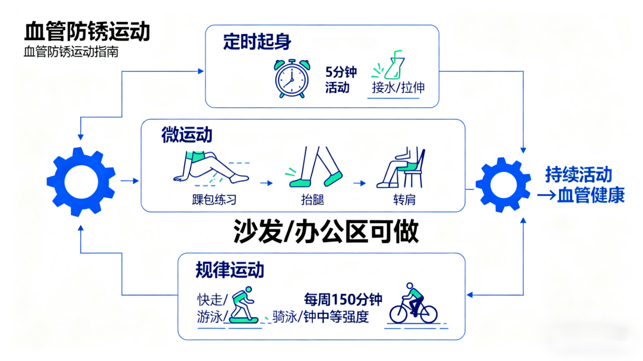 对我们每个人来说,最重要的还是养成主动运动的习惯。别再当“沙发土豆”了,经常让身体动起来,就是最简单又有效的血管“防锈”妙招。
