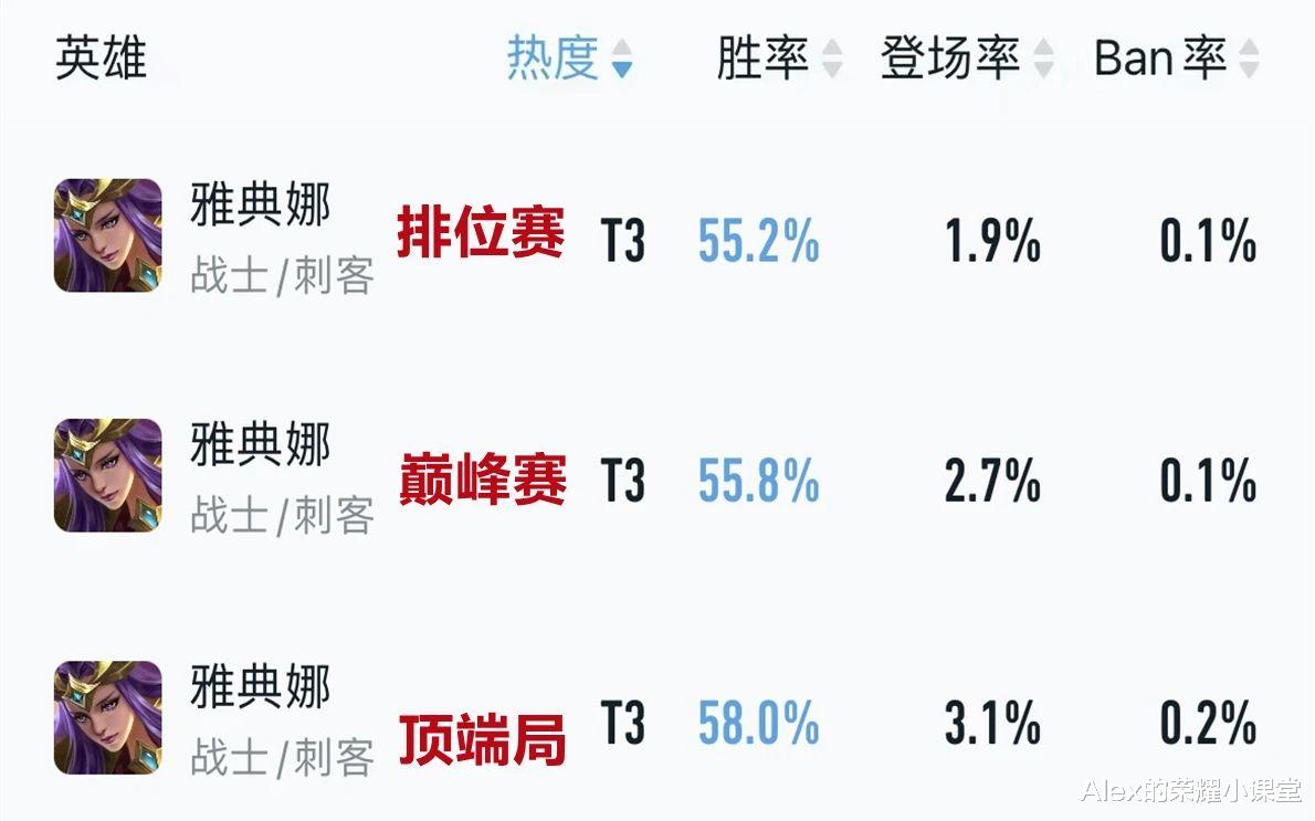 全分段、巅峰赛和顶端局胜率全部登顶打野位第一,尤其顶端局排位胜率高达58%,本期就跟大家分享一下新版雅典娜的玩法技巧。