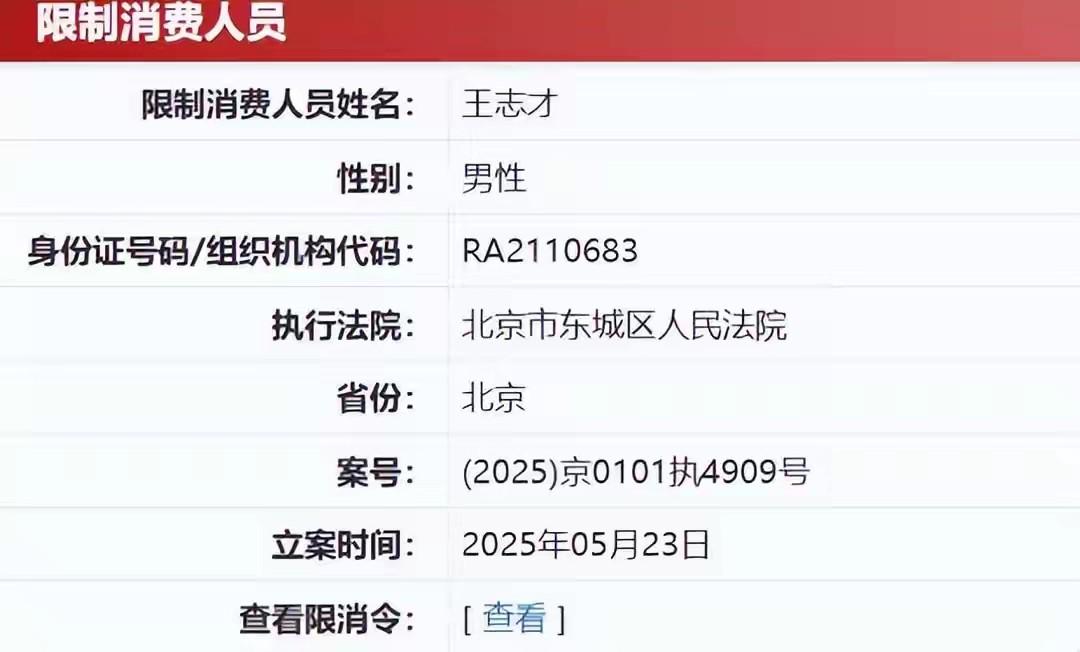 在这个消息传出来后,接下来等待王志才的不仅是限制高消费,
