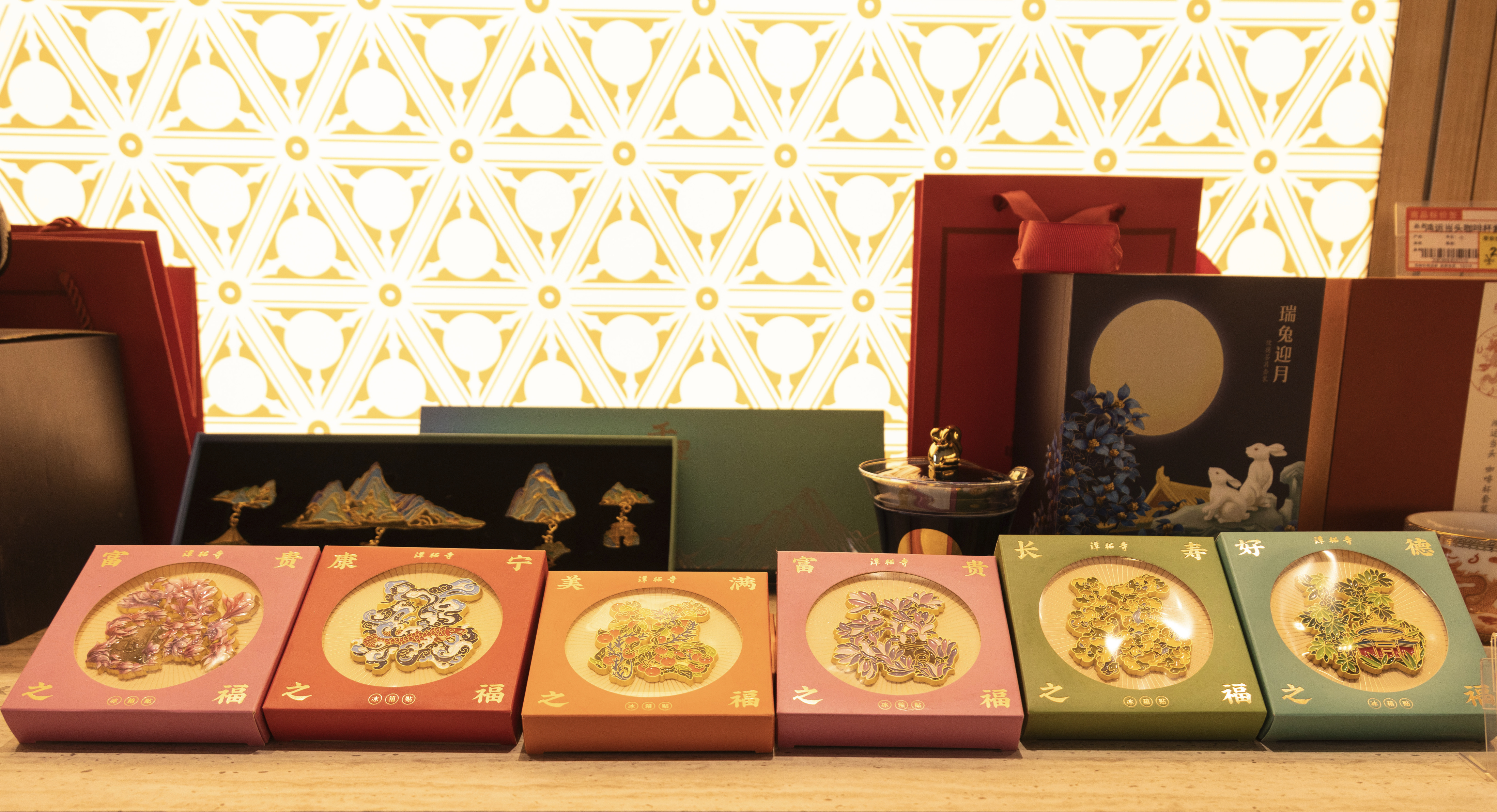 过道中还有一个看上去高大上的店铺,比如在故宫要排队抢的头饰冰箱贴,成套瓷杯,生肖剪纸冰箱贴,福字牌,甚至还有大红的考试套装。