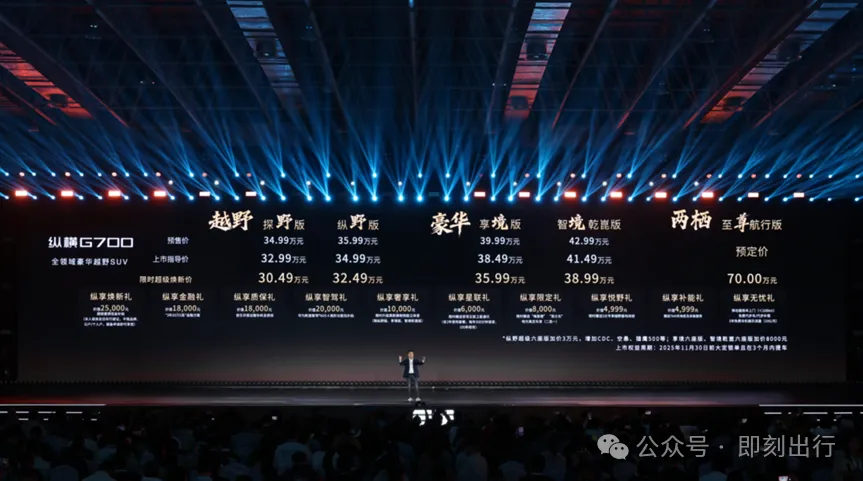 2025年10月19日,安徽芜湖见证了中国汽车工业的重要时刻——纵横品牌首款量产车型G700全球上市发布会在此启幕。这款定位“全领域豪华越野SUV”的新车,携4个版型正式登陆市场,官方指导价32.99万元—41.49万元,限时超级焕新价低至30.49-38.99万元,以“40万元级价格、百万级体验”的价值颠覆,宣告中国品牌在豪华越野领域的全面突围。