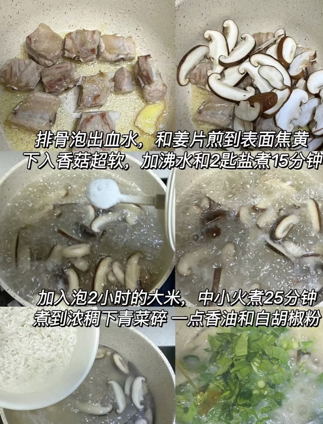 懒人彩蛋:电饭煲版一样香!煎好排骨香菇后连米带水倒进电饭煲,按“煮粥”键,跳闸就能吃,稠度不够就再按一次“加热”,全程不用看火,适合追剧党。剩粥第二天更厉害,微波两分钟变“排骨米糕”,拌酱油都好吃;或者加开水调成稀粥,打个蛋花,秒变排骨蛋花汤,早餐直接顶配。健身党把大米换成糙米,饱腹感翻倍;宝宝吃就提前把排骨去骨撕碎,粥里加胡萝卜丁,营养全齐。