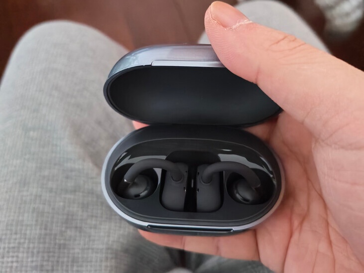 它采用了柔性力学架构加人体工学设计,单耳5.5g,佩戴平衡感不错,能顺着耳廓弧度贴合,日常戴不容易掉。但长时间佩戴会有夹耳感,耳廓容易不舒服,舒适性只能算普通水平。