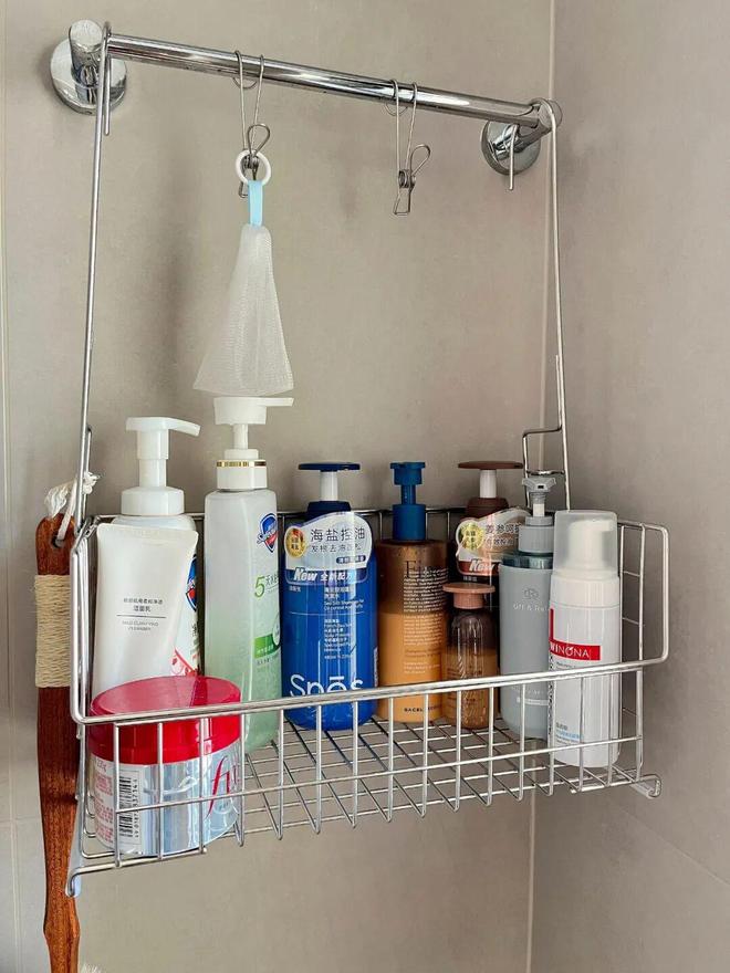 浴室里洗浴用品太多,想买一个置物架?可以去搜「不锈钢挂篮」,只要有支点,想挂哪里都挂哪里。