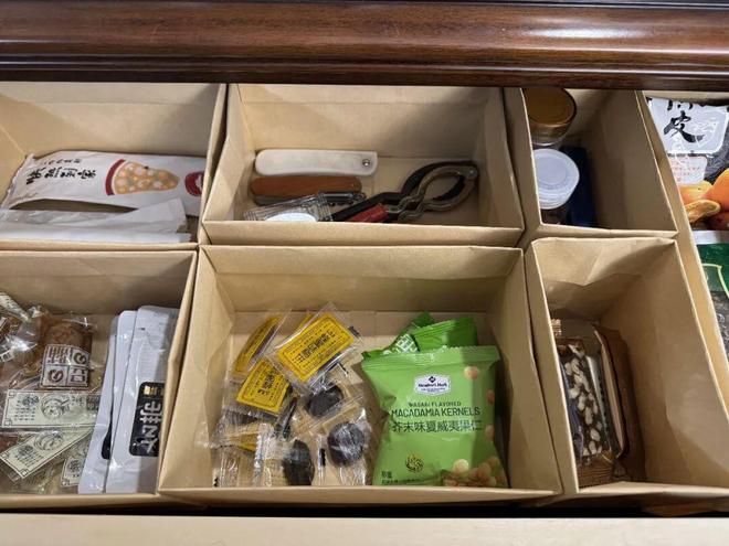 相较于收纳盒,牛皮纸袋最大的优势,就是在给抽屉分类时,可以根据空间大小对纸袋进行排列组合。