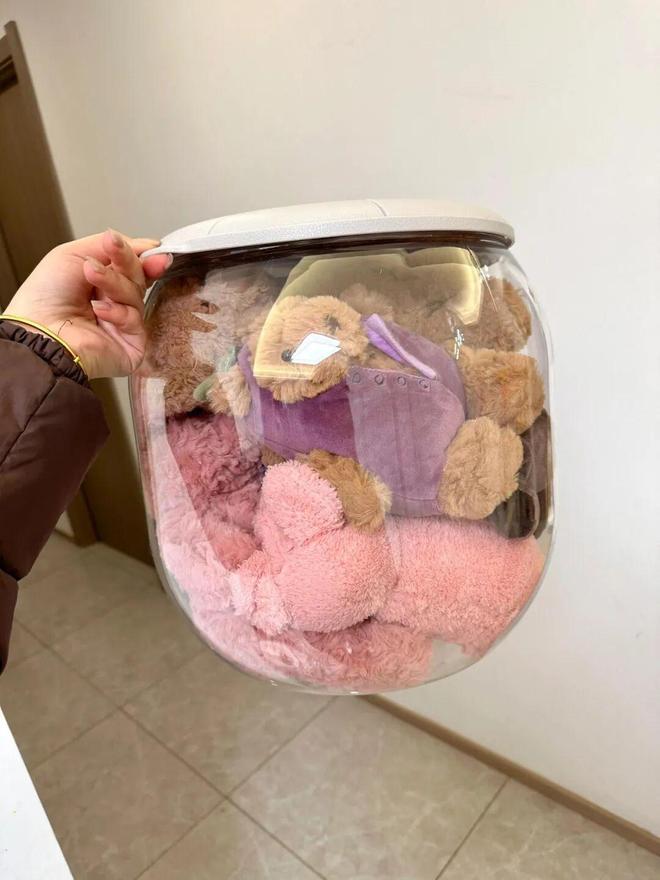 家里娃娃太多,想买一个可以展示的收纳箱?可以搜「透明收纳凳」,容量有22升左右,价格十几块。
