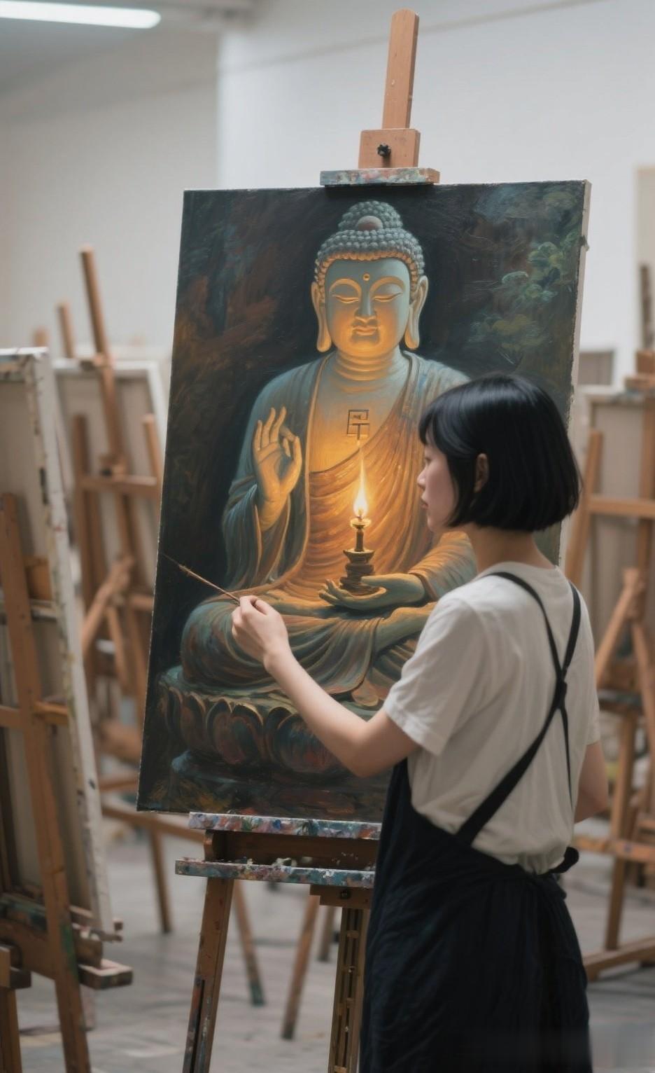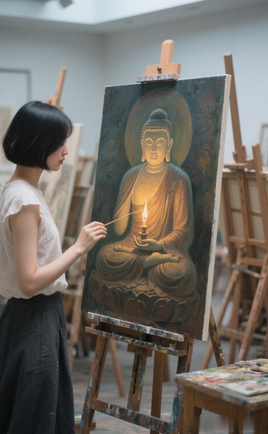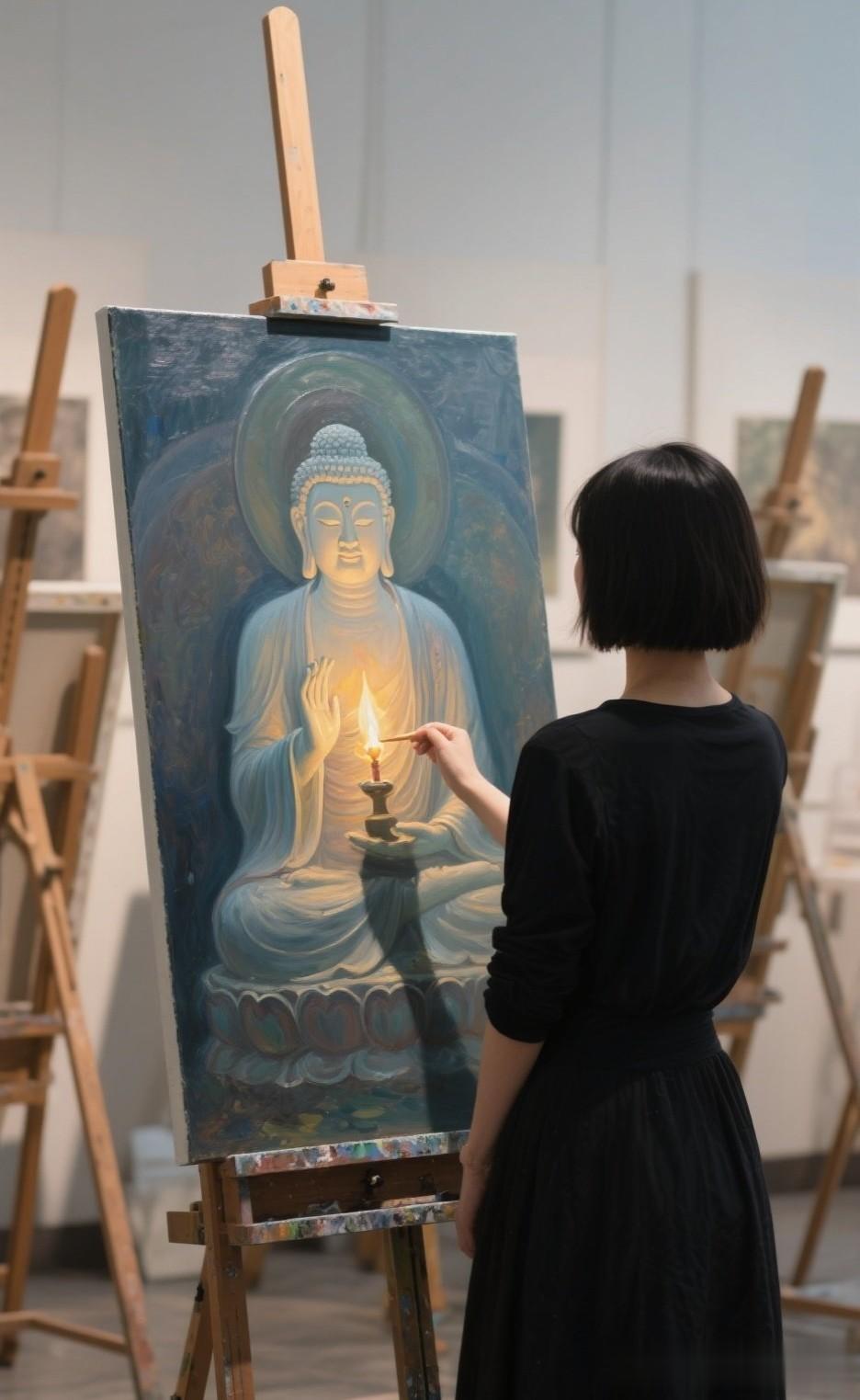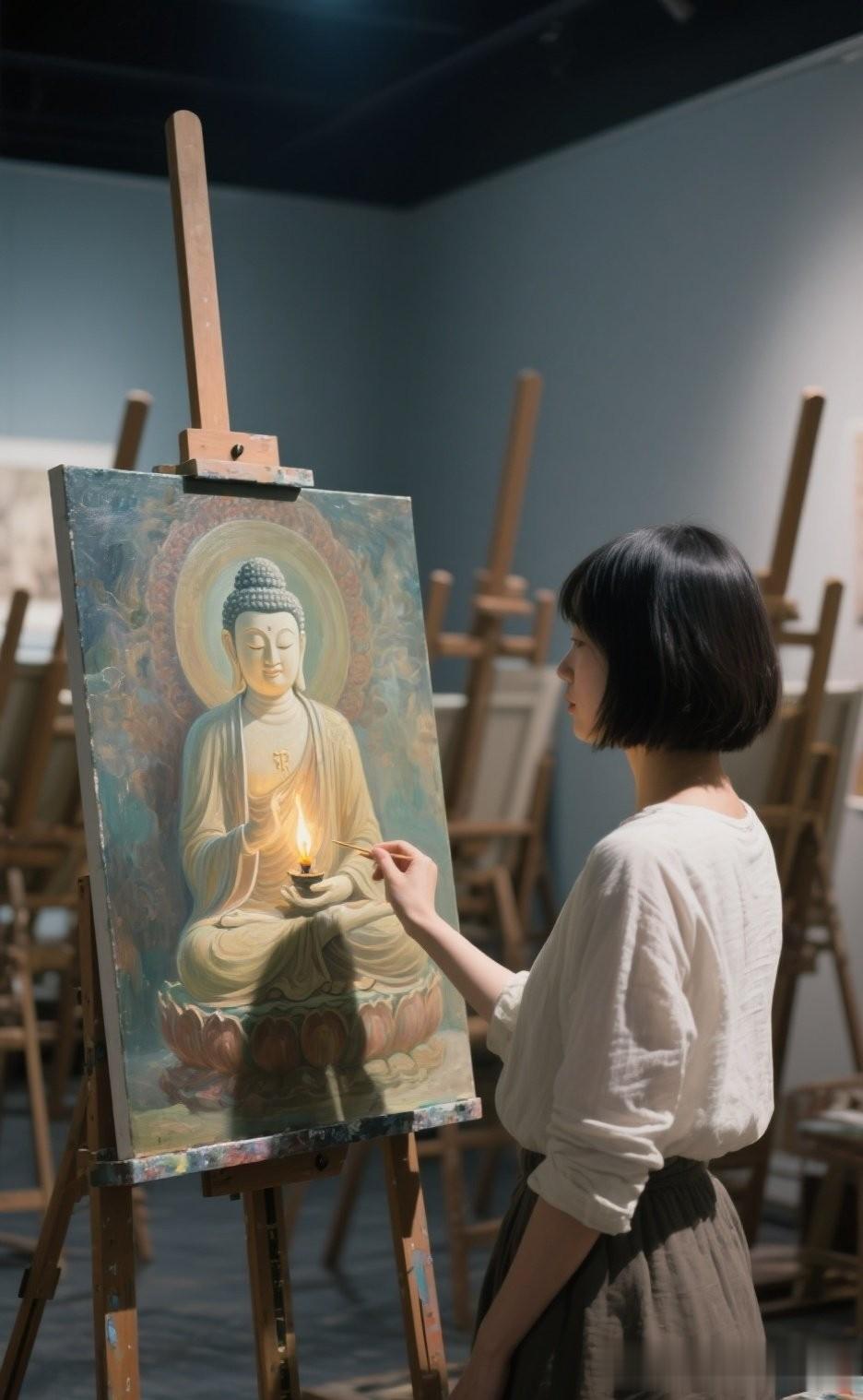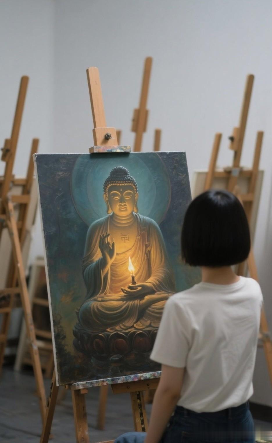 它以油画这种现代艺术形式展现古老的佛教文化,让古老的信仰在现代的艺术语境中焕发出新的生命力。无论是对于佛教信众,还是对于艺术爱好者,这幅画都是一座连接心灵与艺术、宗教与现代文化的桥梁,引领我们在色彩与线条的世界里,感悟佛韵与禅意的无尽魅力。