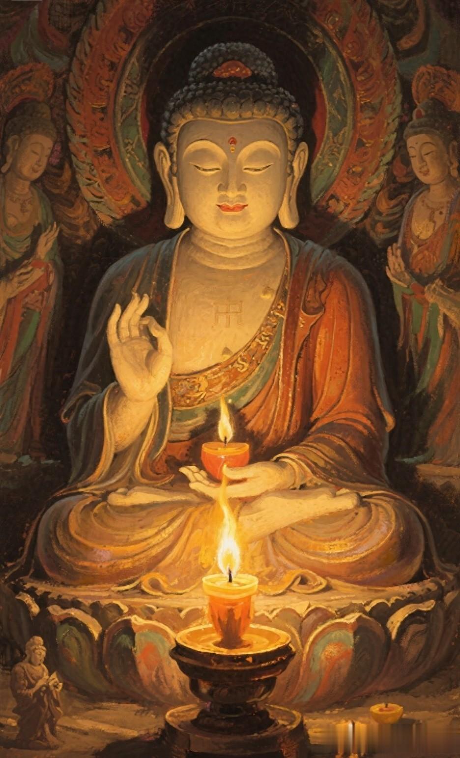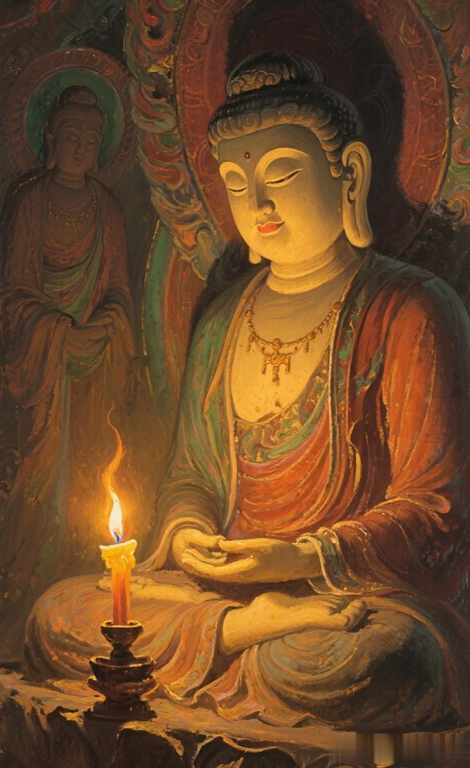 在油画的绚烂世界里,一幅《燃灯古佛》宛如一颗来自遥远佛国的璀璨星辰,散发着神秘而深邃的光芒,吸引着观者踏入一场视觉与心灵的双重朝圣之旅。