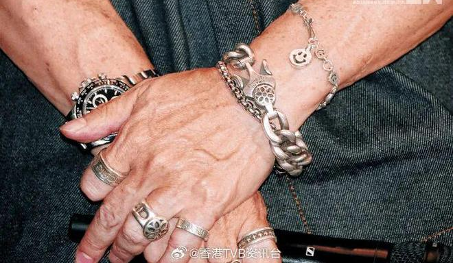 双手佩戴六枚戒指、三条手链,右手搭配劳力士迪通拿腕表,全身配饰行头价值约30万港元。