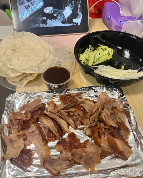 卤好的肉取出晾凉,吃之前放入烤炉炙烤。烤到外皮金黄酥脆,油脂滋滋作响,香气四溢。师傅用刀将肉切成薄片,皮肉相连,晶莹剔透。吃的时候,取一张荷叶饼,抹上甜面酱,放上几片烧腊,再配上黄瓜丝、葱丝,卷起来送入口中。饼的软糯、肉的醇香、酱的甜咸、蔬菜的清爽,在口中交织,层次丰富,回味无穷。