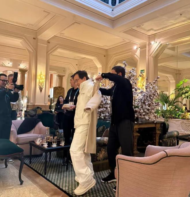 成龙作为世界巨星,走到哪都是前呼后拥,有网友在意大利某酒店偶遇成龙,当时成龙背对着该网友坐着,对面都是一些工作人员在招待他。成龙在那换上了特色服饰,戈洛夫金很周到地替他更衣,现场的外国工作人员都笑得合不拢嘴,成龙也挺高兴,他一向是这么亲和热情,走到哪都能交到朋友。成龙这次来米兰也并非他一个人,儿子房祖名随行跟着,现场房祖名穿着一身黑,戴着黑色帽子,他今年43岁了,长得越来越像成龙了,侧脸看着和年轻时候的龙叔很像,房祖名这些年也变成熟了,气质没了当年的轻狂浮躁。